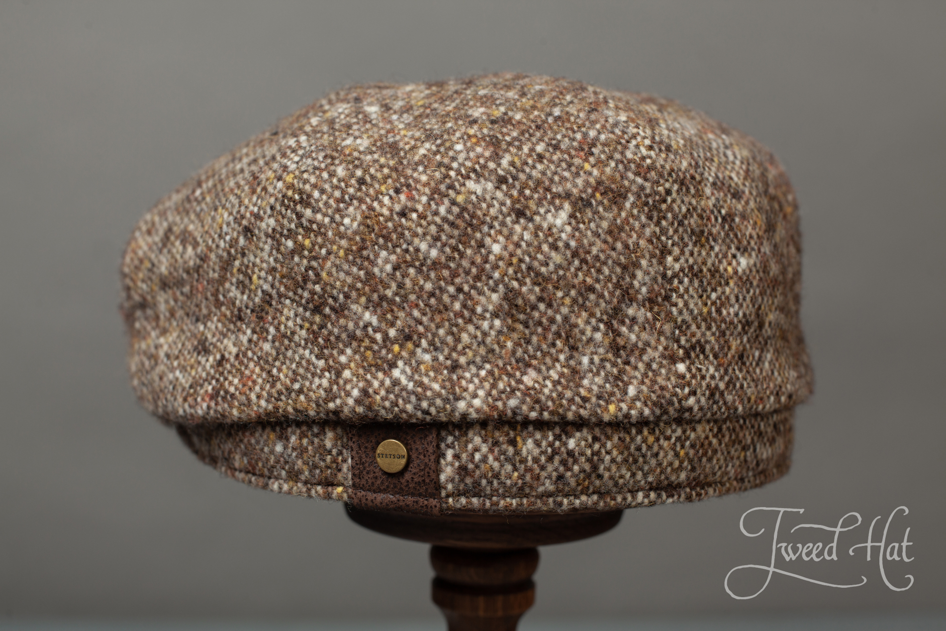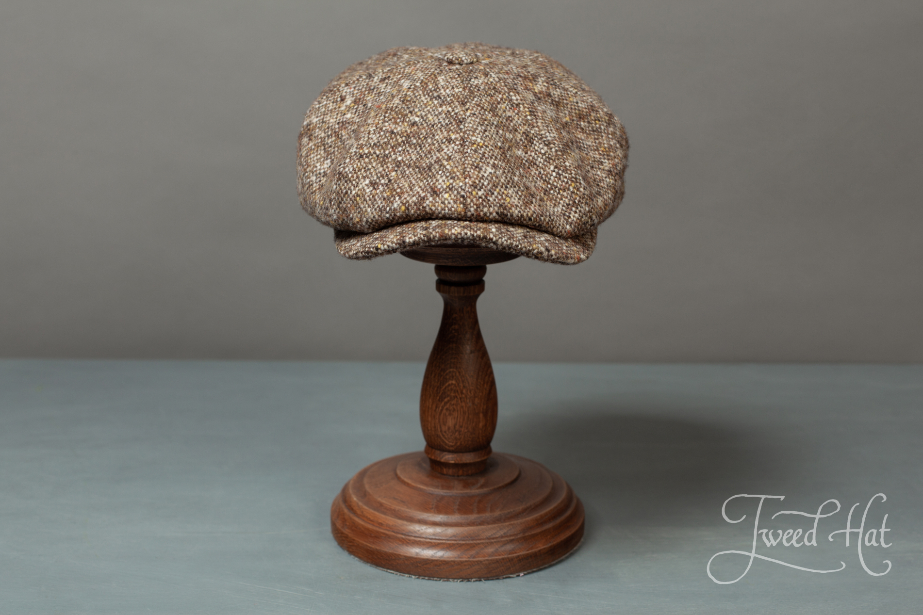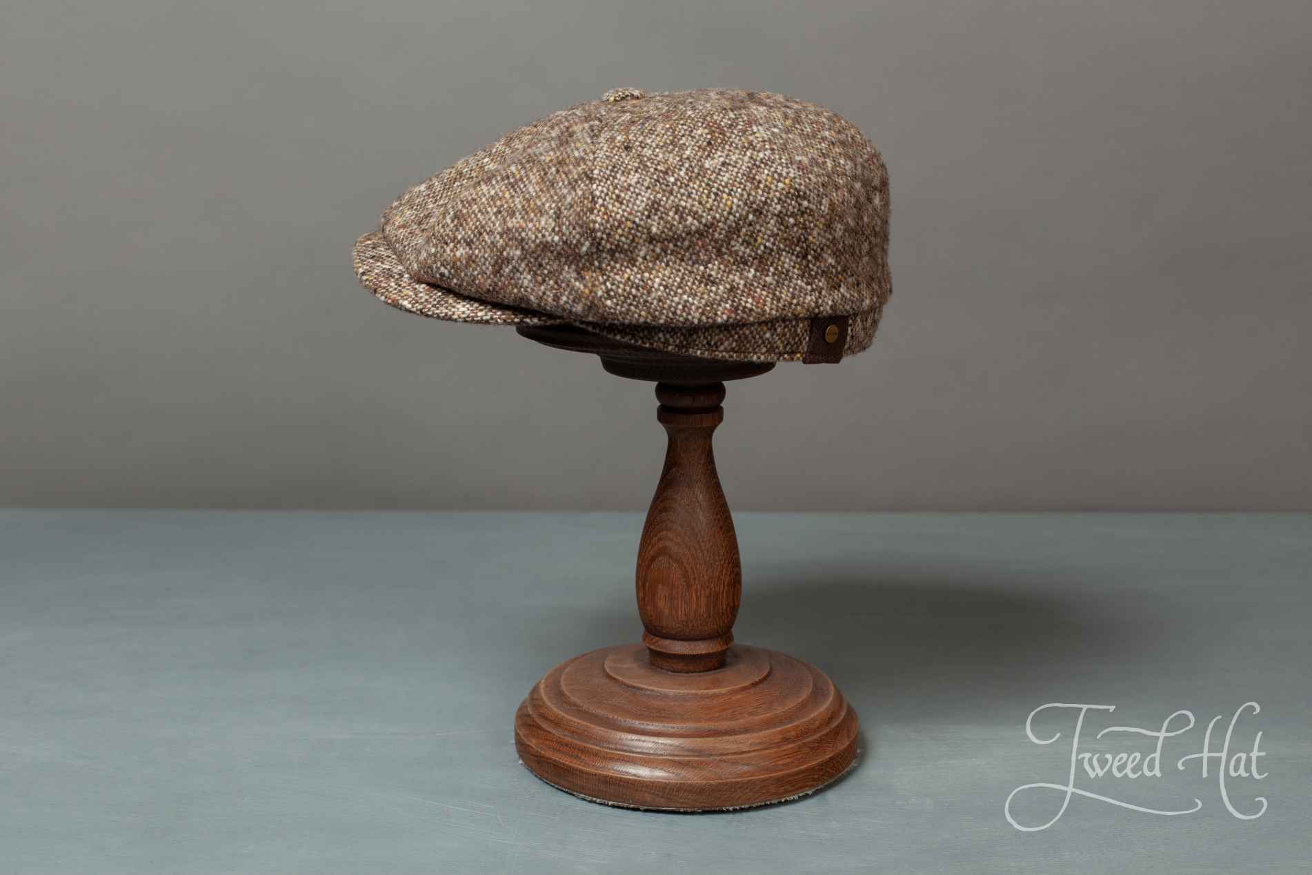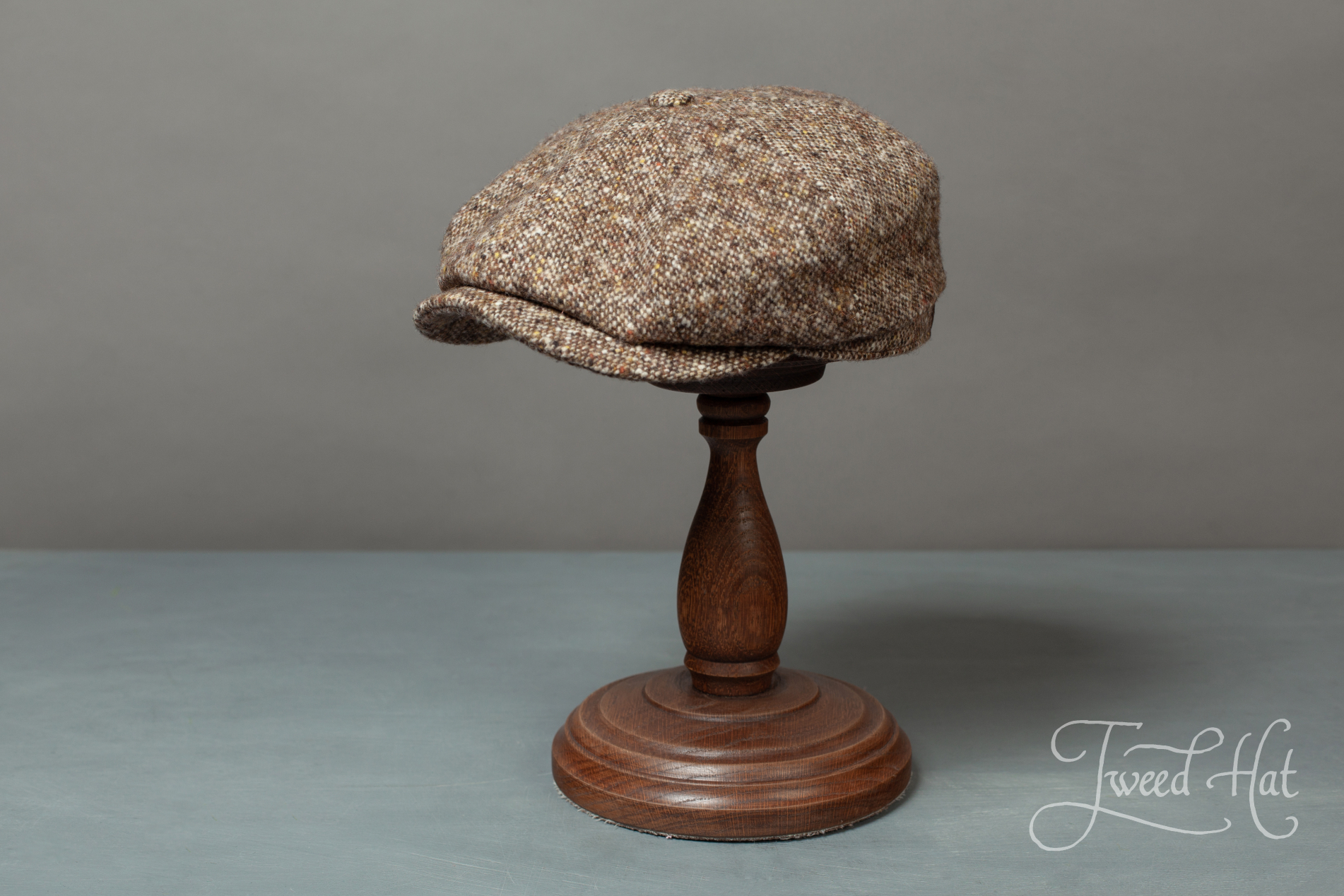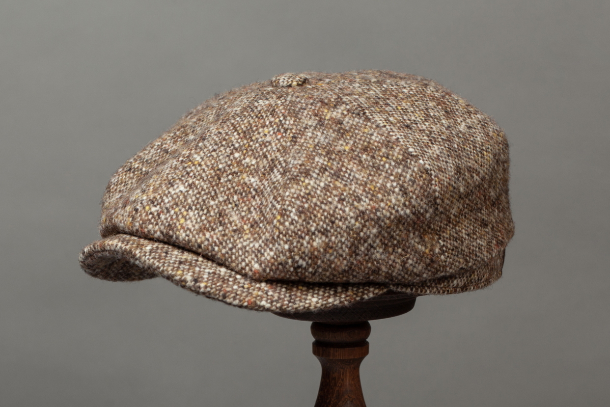 The cap is made of soft and dense Donegal style tweed in beige and blue hues, with inclusions of other colors.