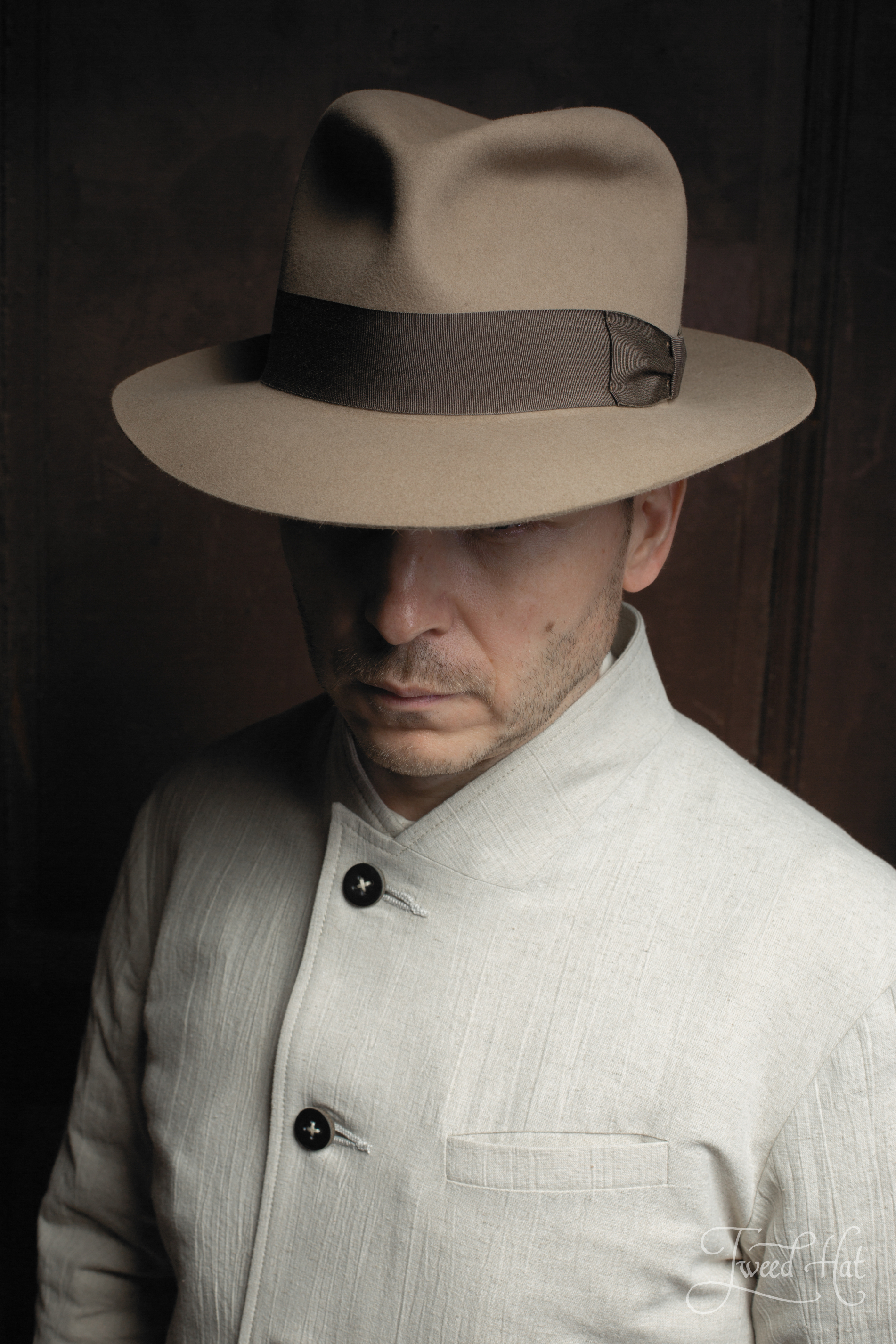 The hat's shape echoes classic fedoras of the first half of the 20th century: a high crown, a strongly curved brim, and a wide band.