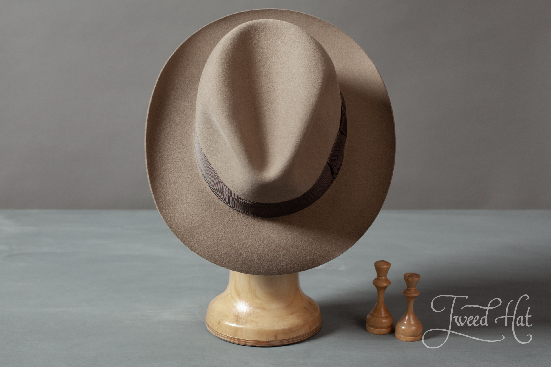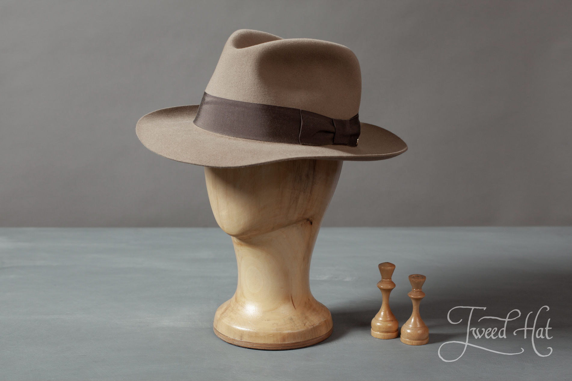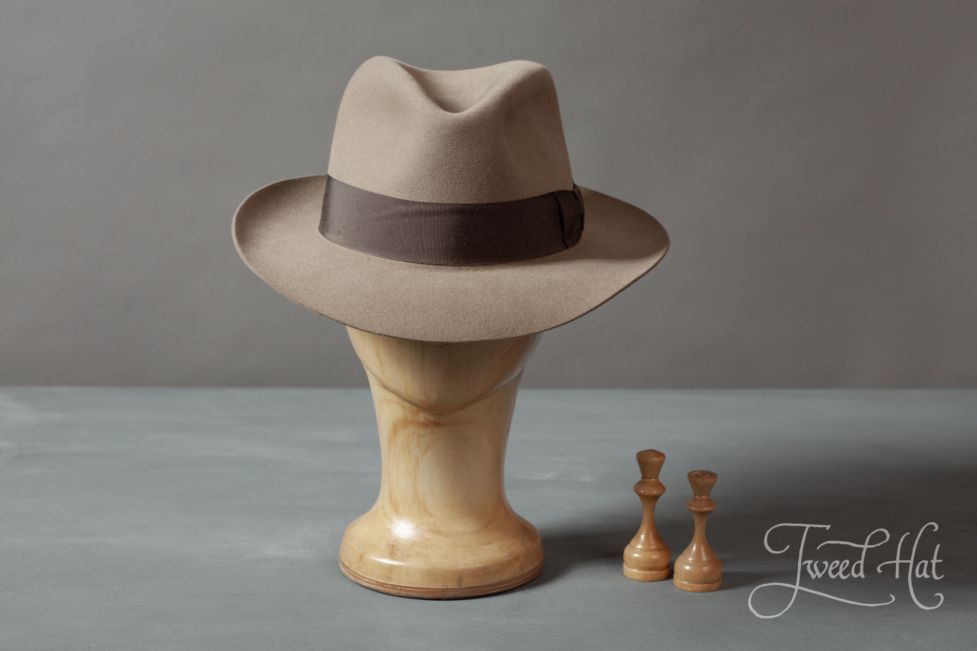 The hat's shape echoes classic fedoras of the first half of the 20th century: a high crown, a strongly curved brim, and a wide band.