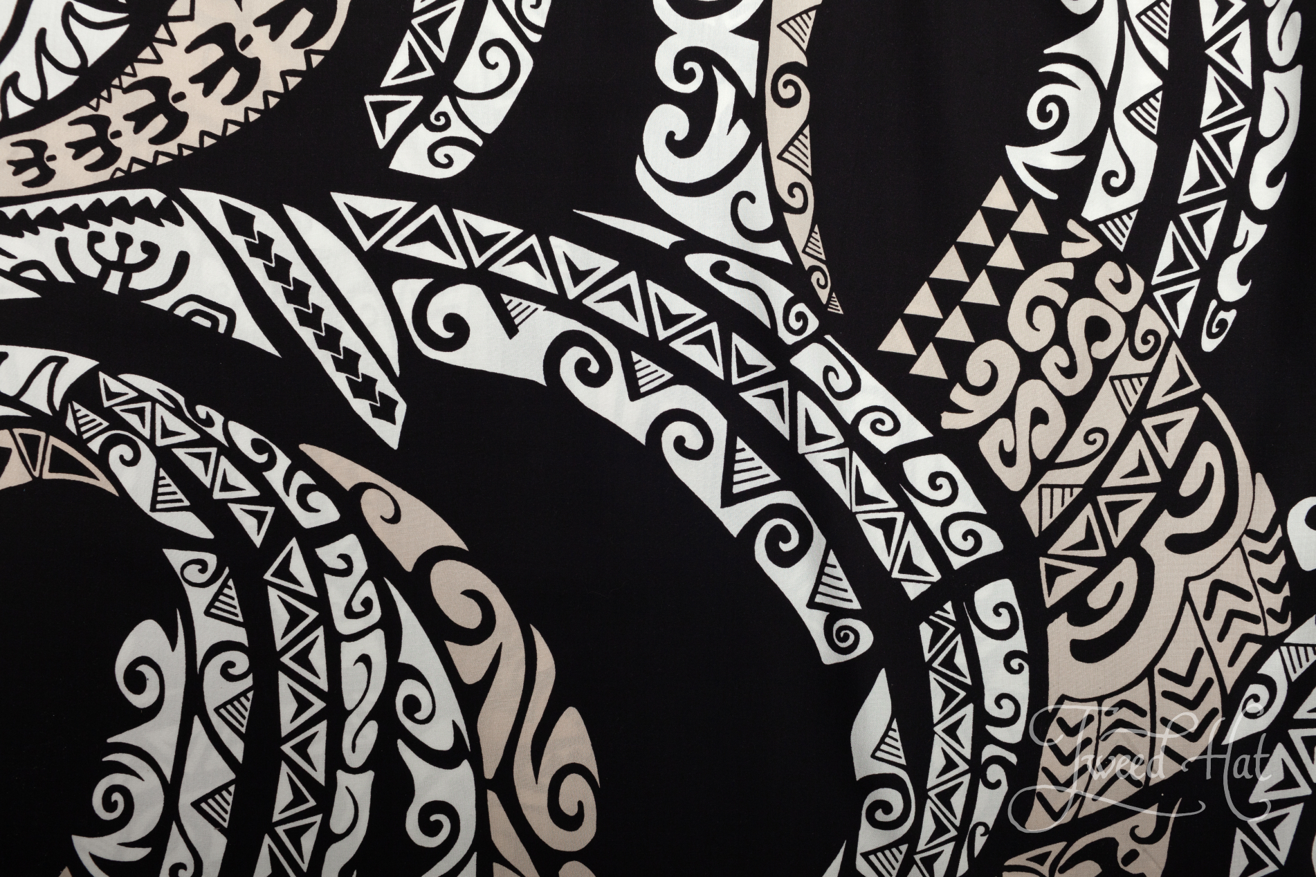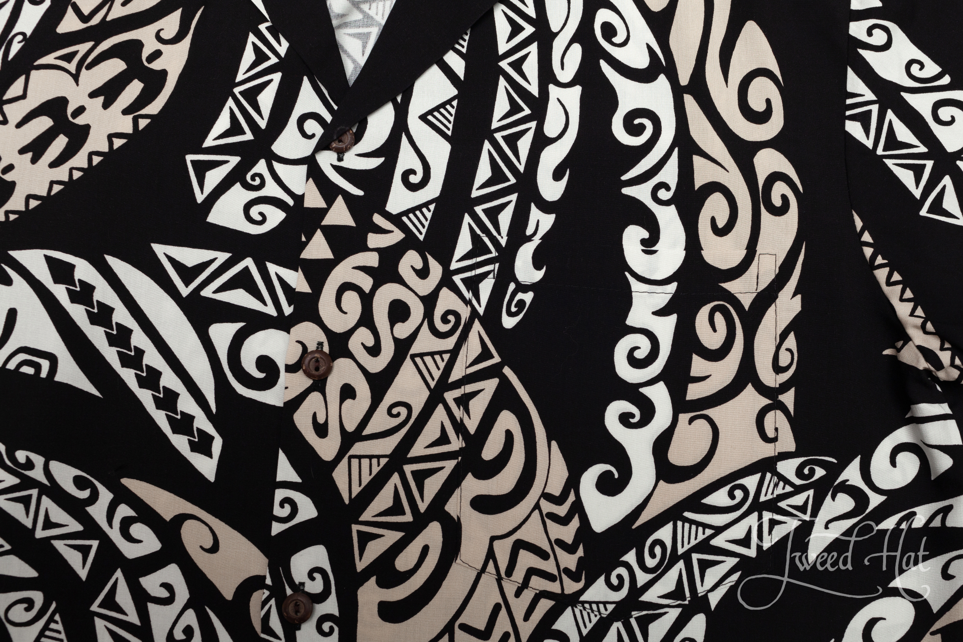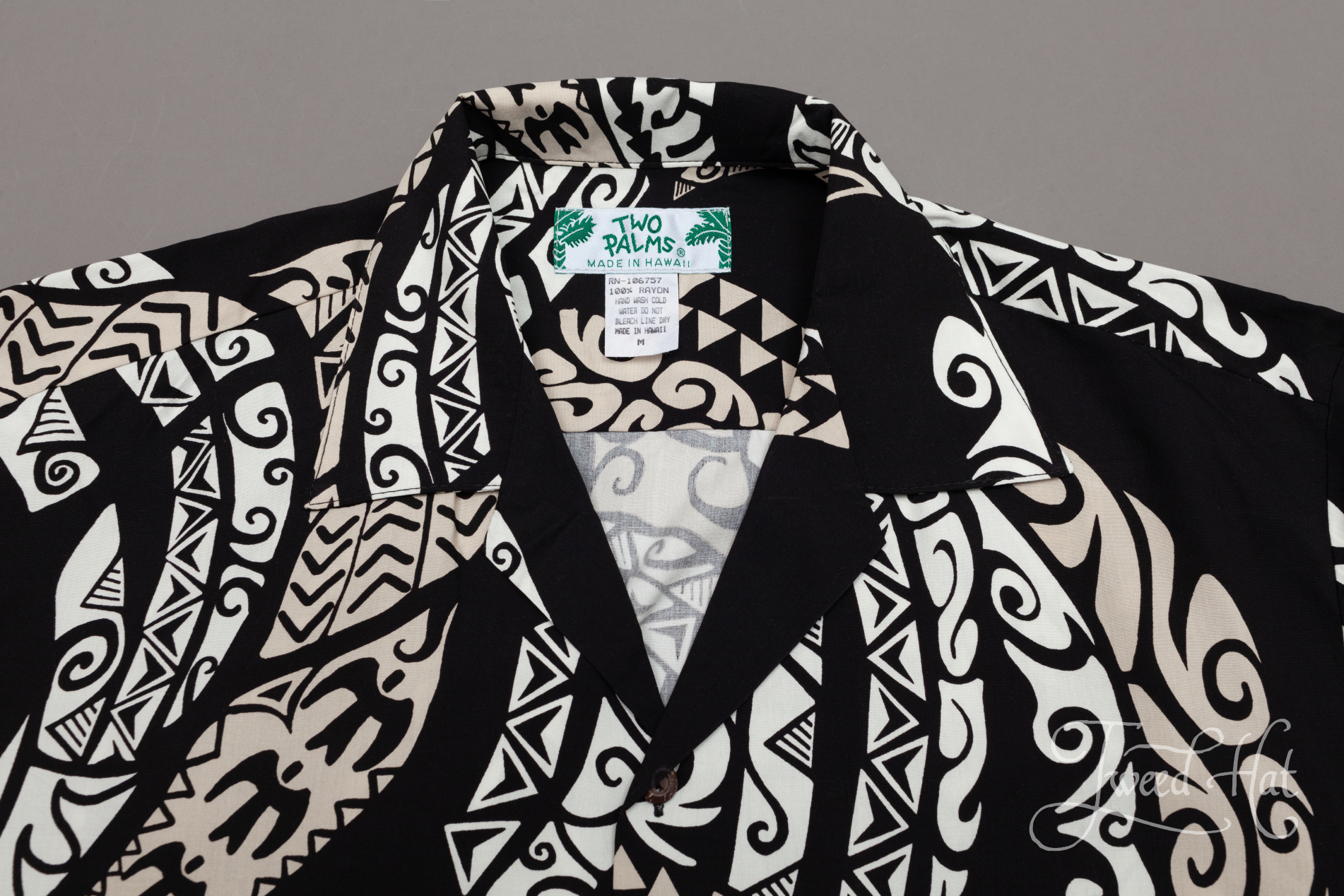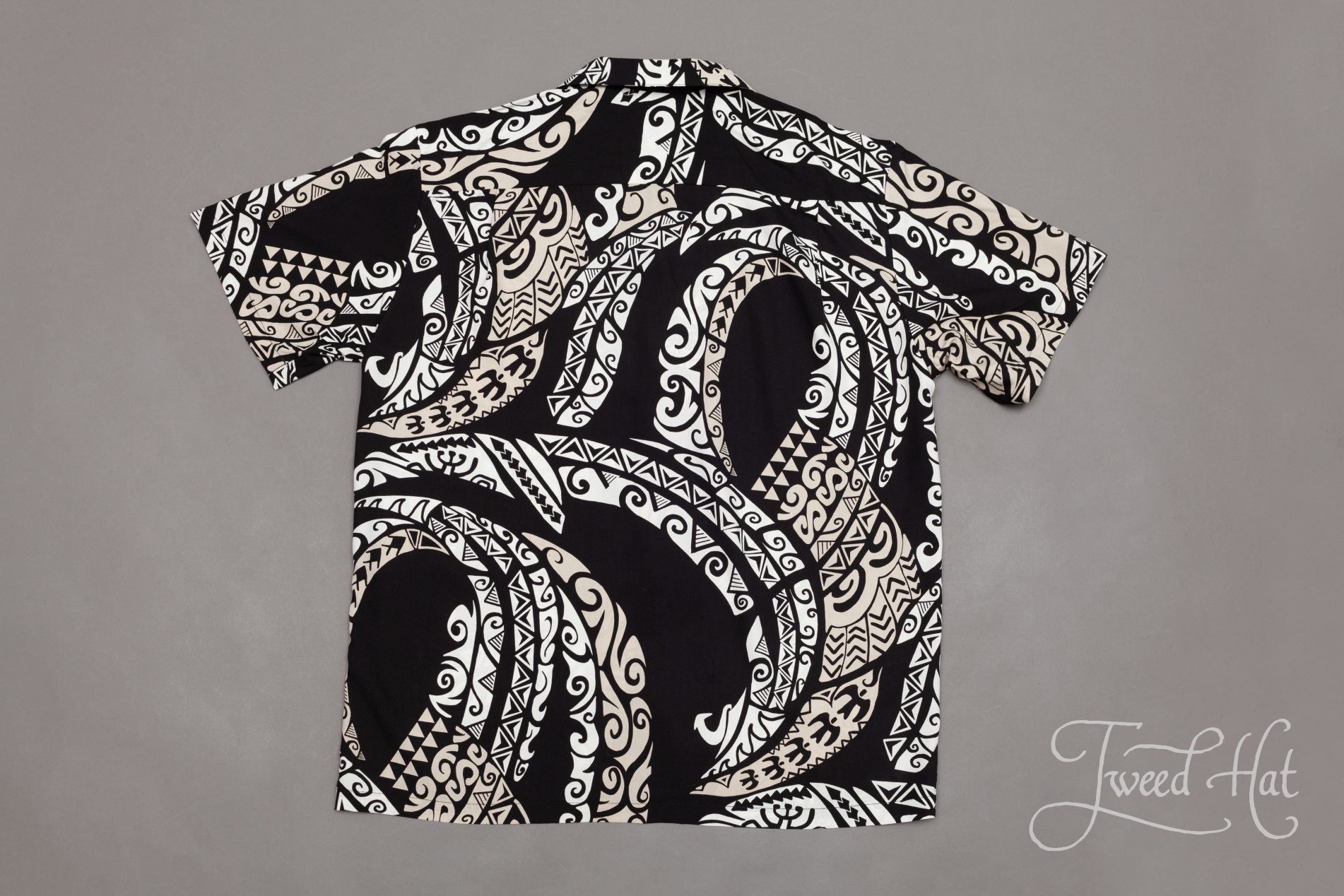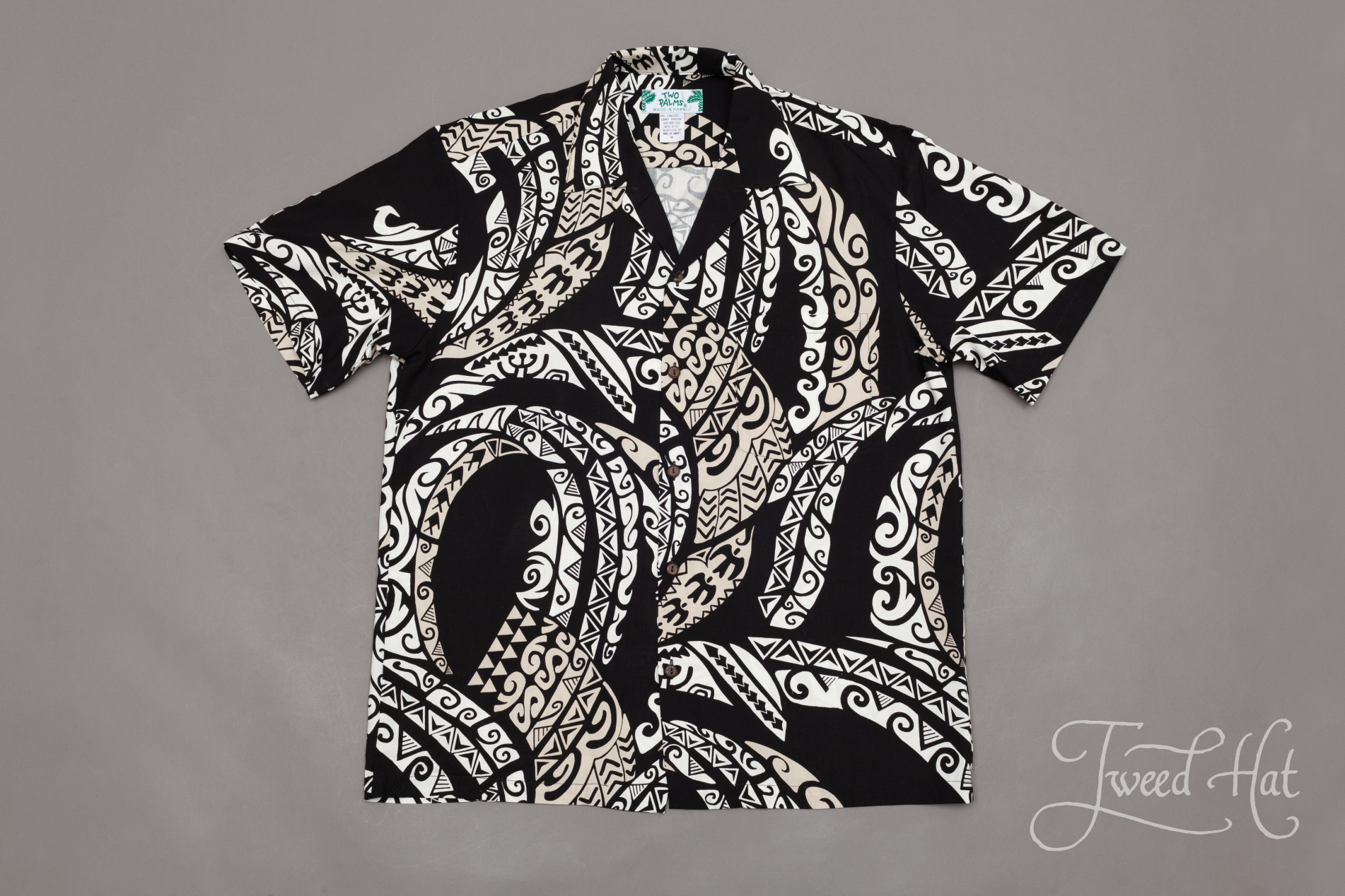 Black Rayon Aloha Shirt with Hawaiian Tattoo by Two Palms Hawaii