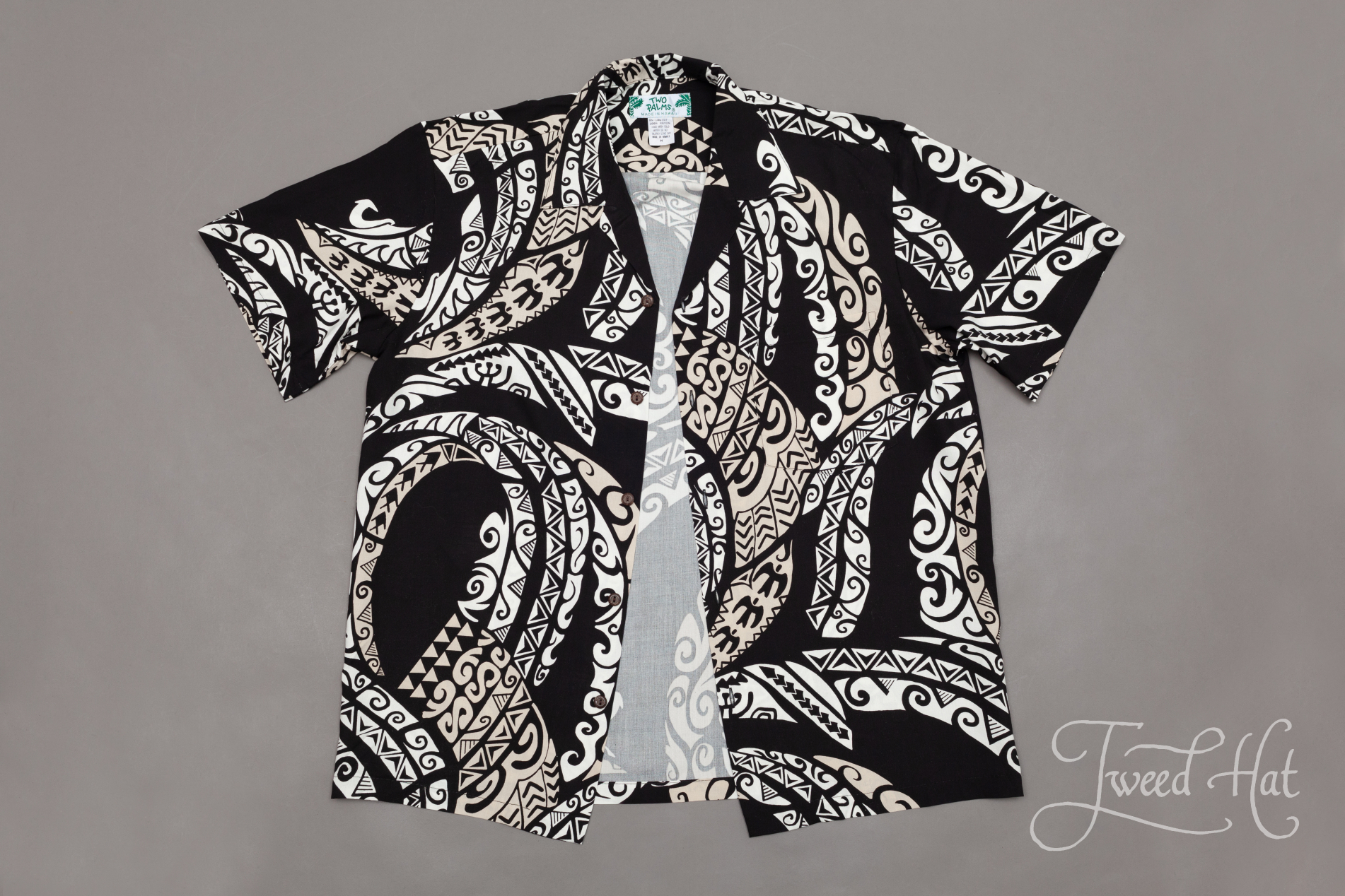 Черная гавайская рубашка с гавайскими татуировками из рэйона Two Palms Hawaii /100% Rayon/