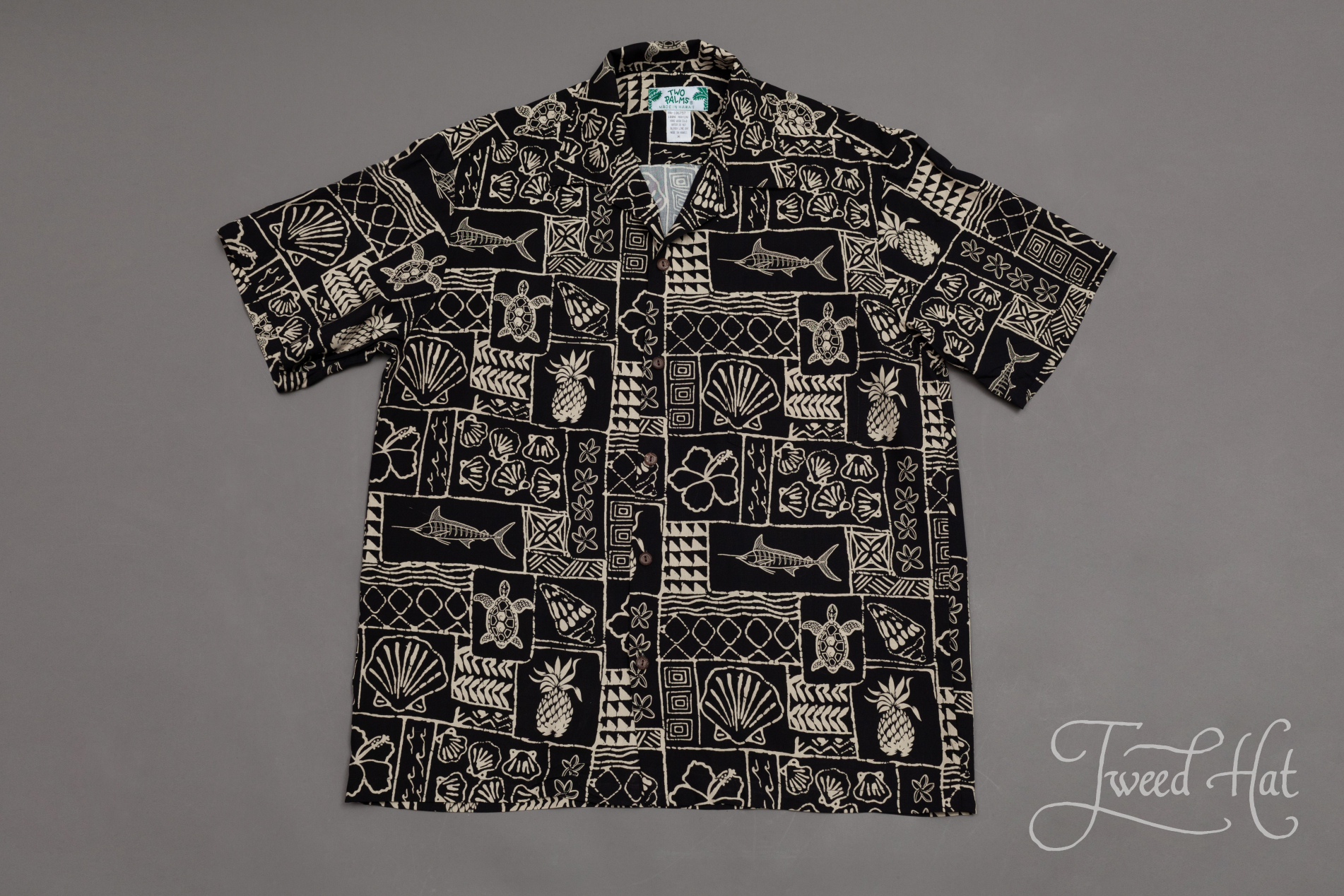 Черная гавайская рубашка с марлином и ракушками из рэйона Two Palms Hawaii /100% Rayon/