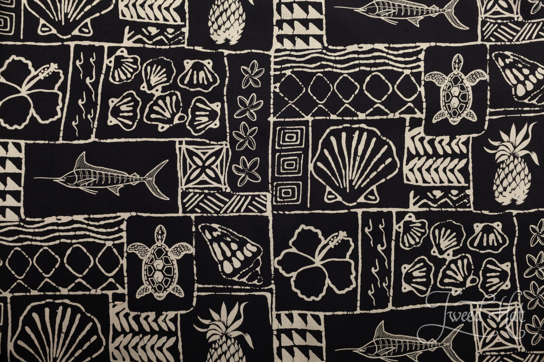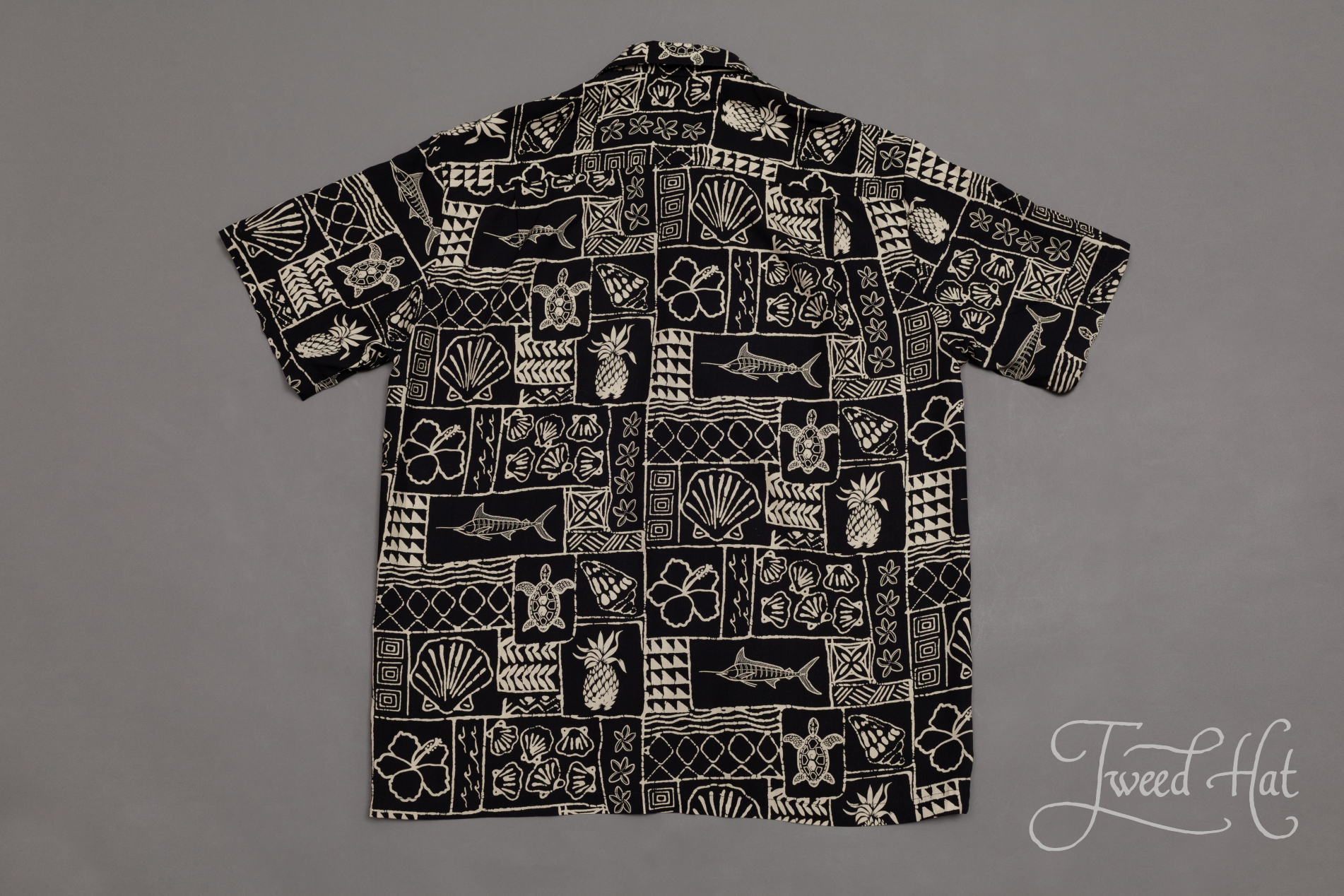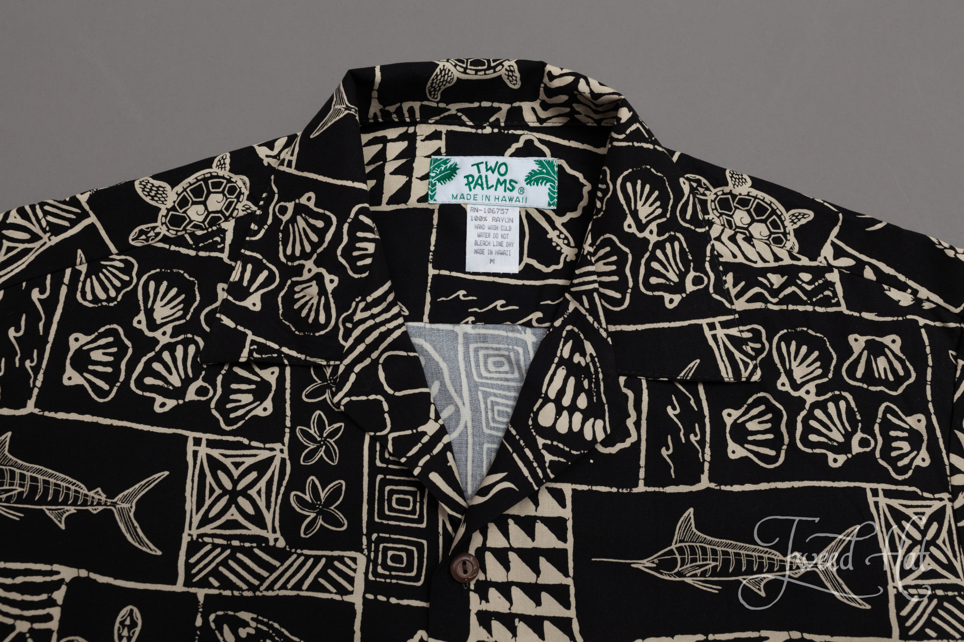 Black Rayon Aloha Shirt with Marlin and Seashells by Two Palms Hawaii