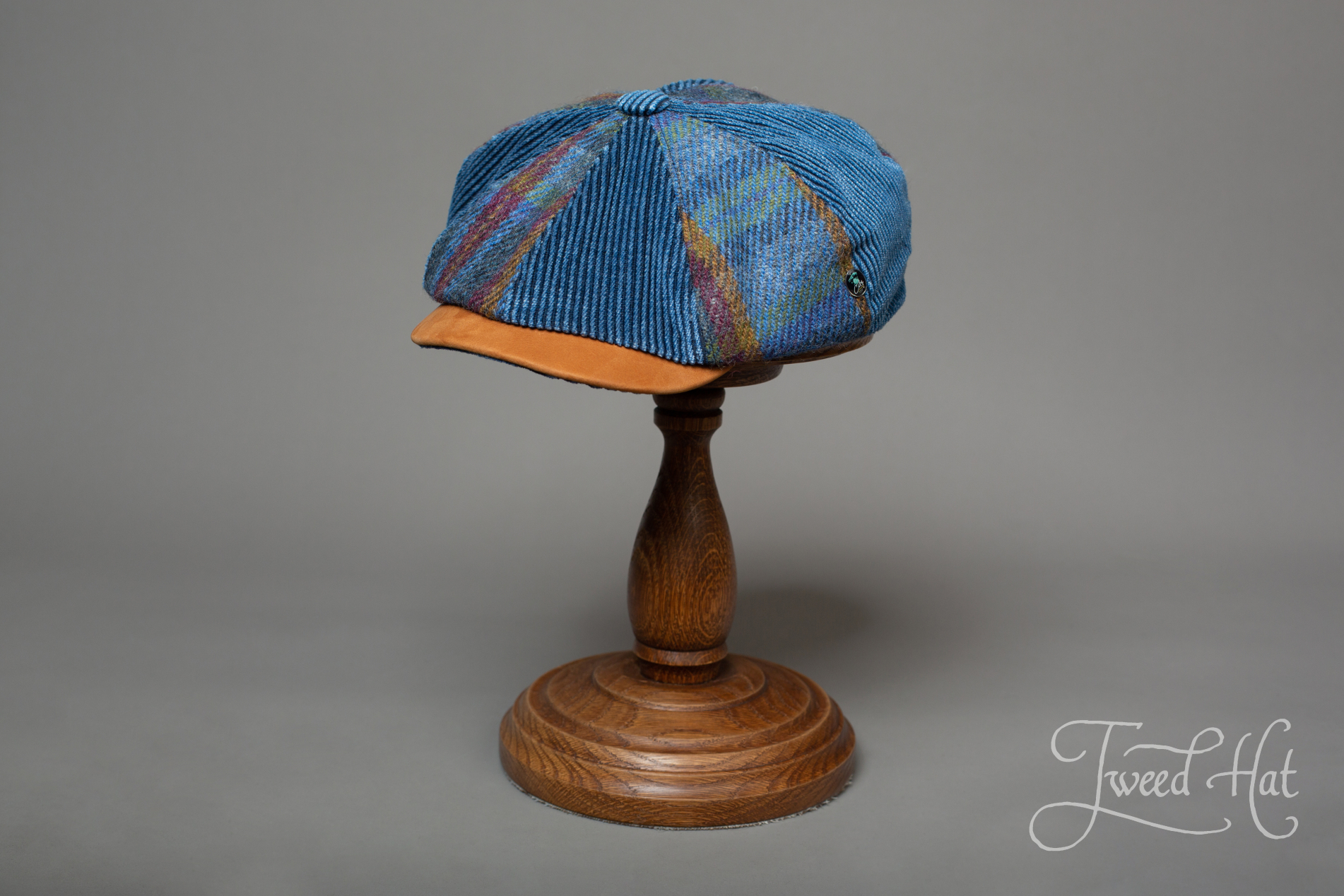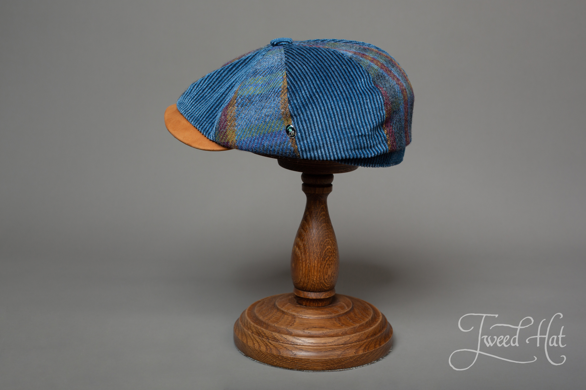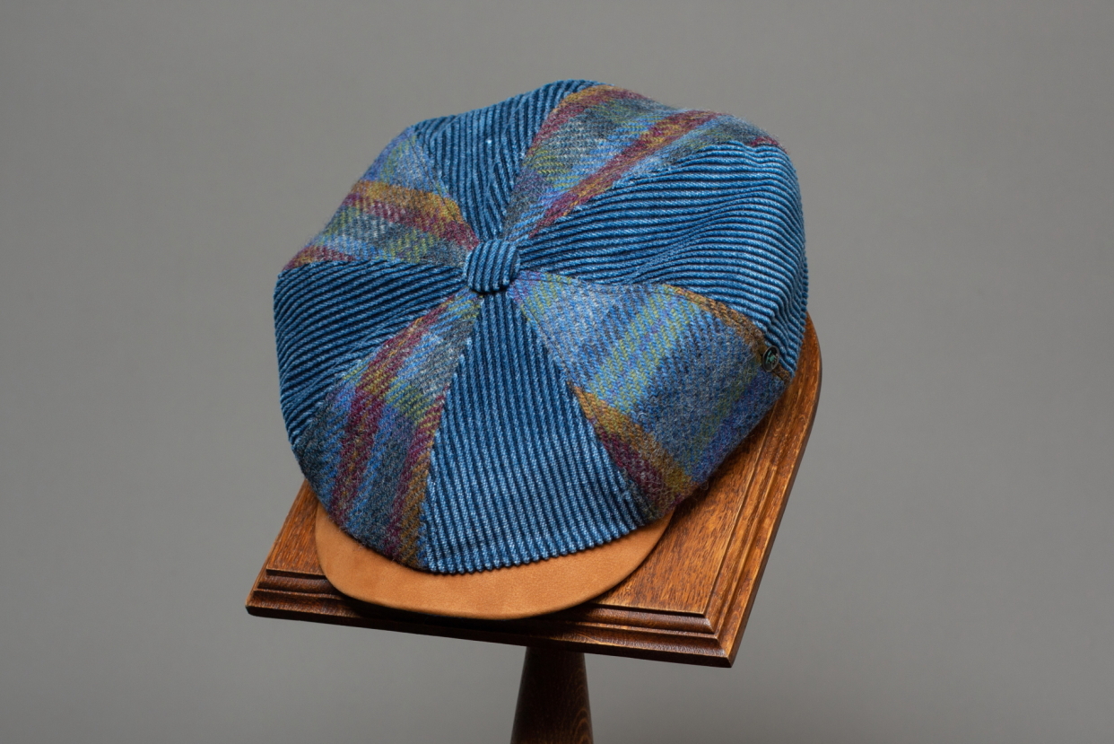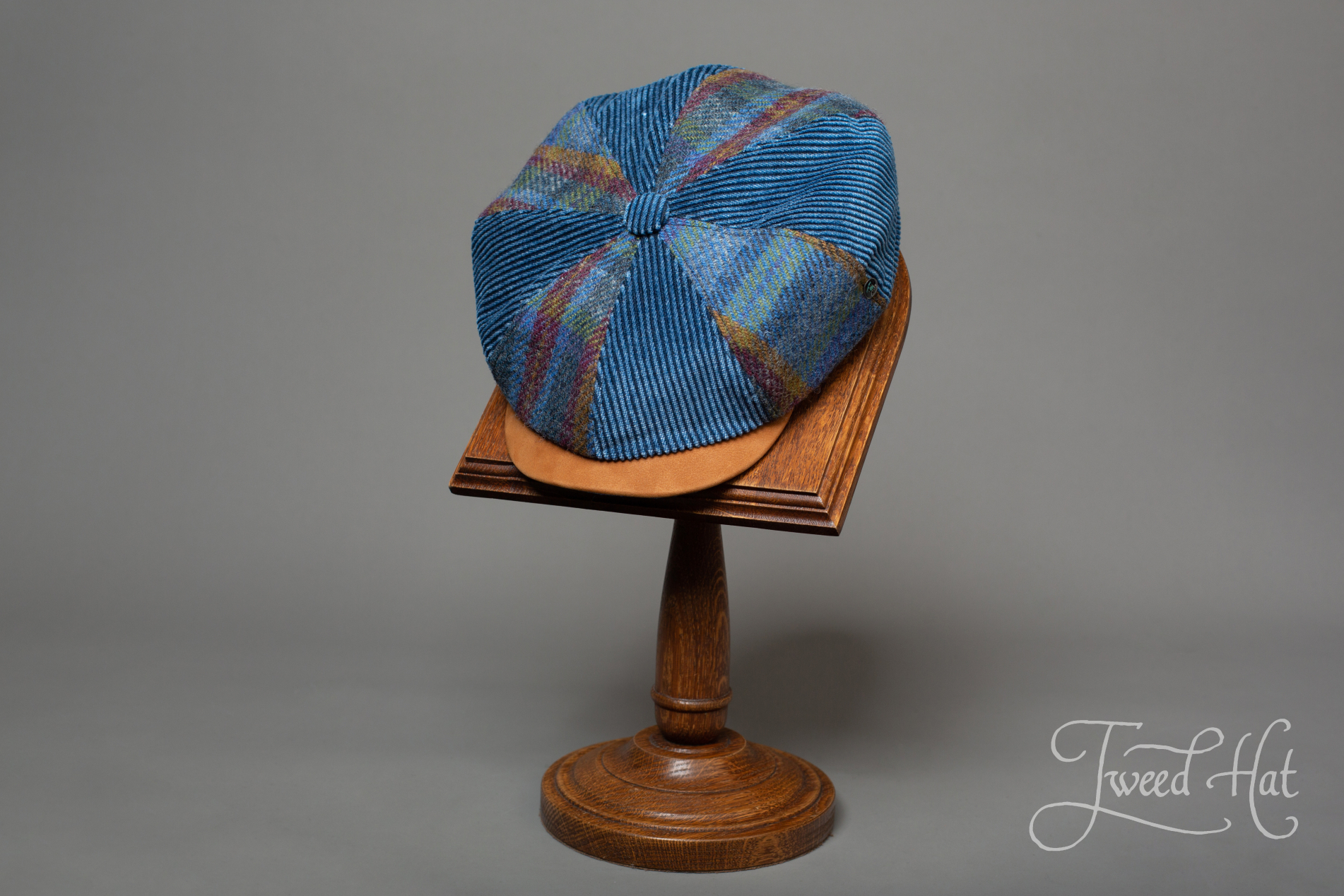 - cap peaks are made of two materials: checked British tweed and textured corduroy,