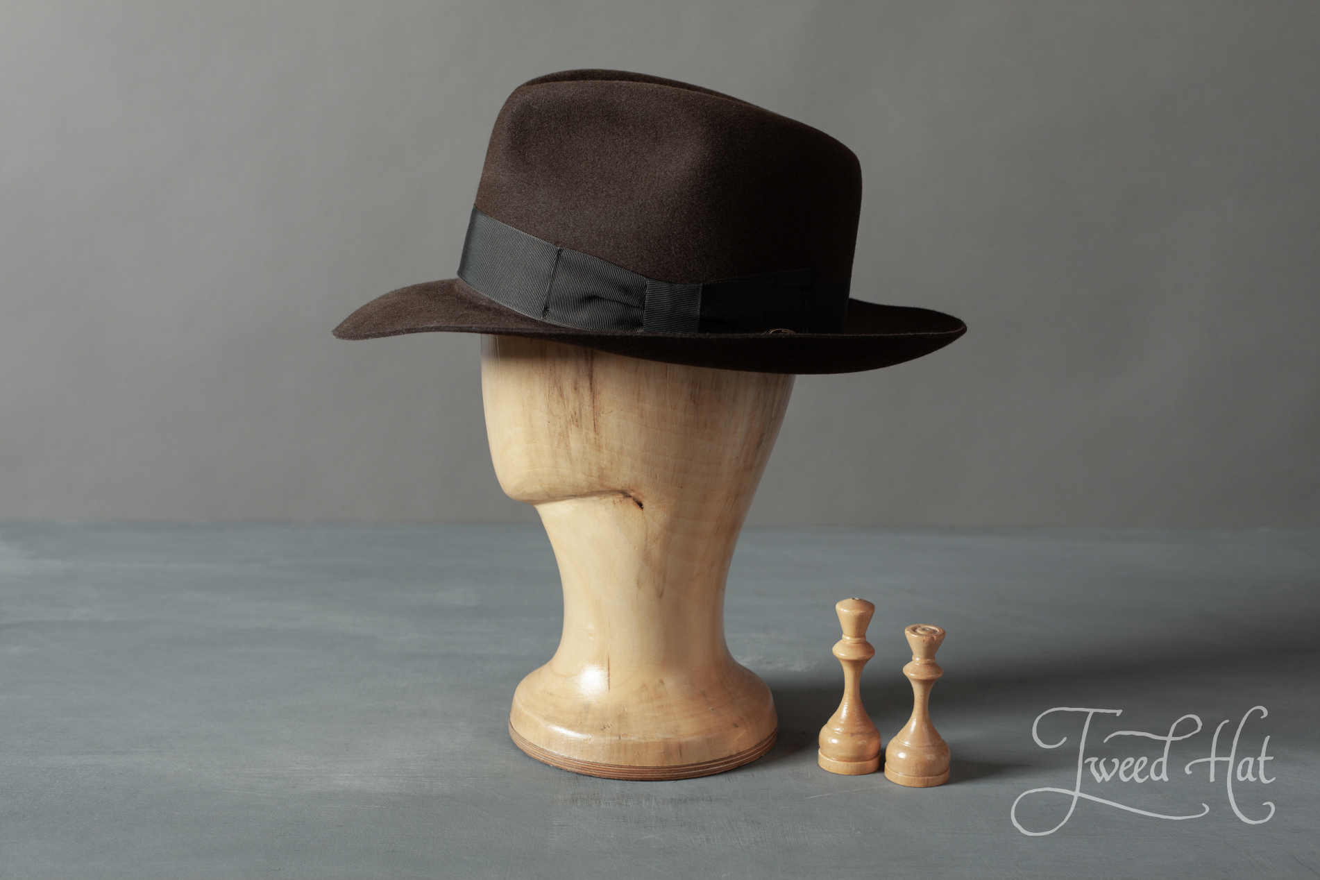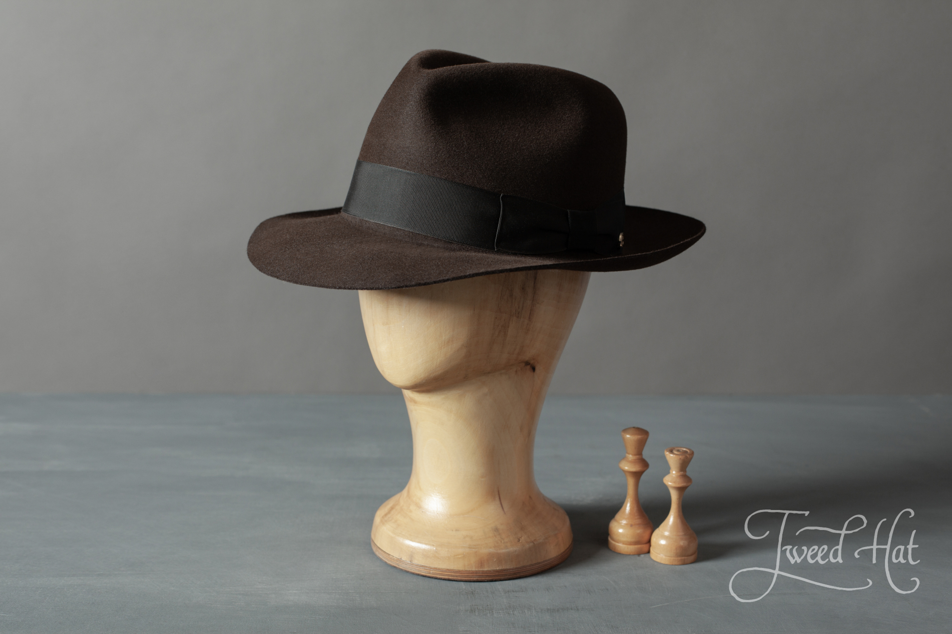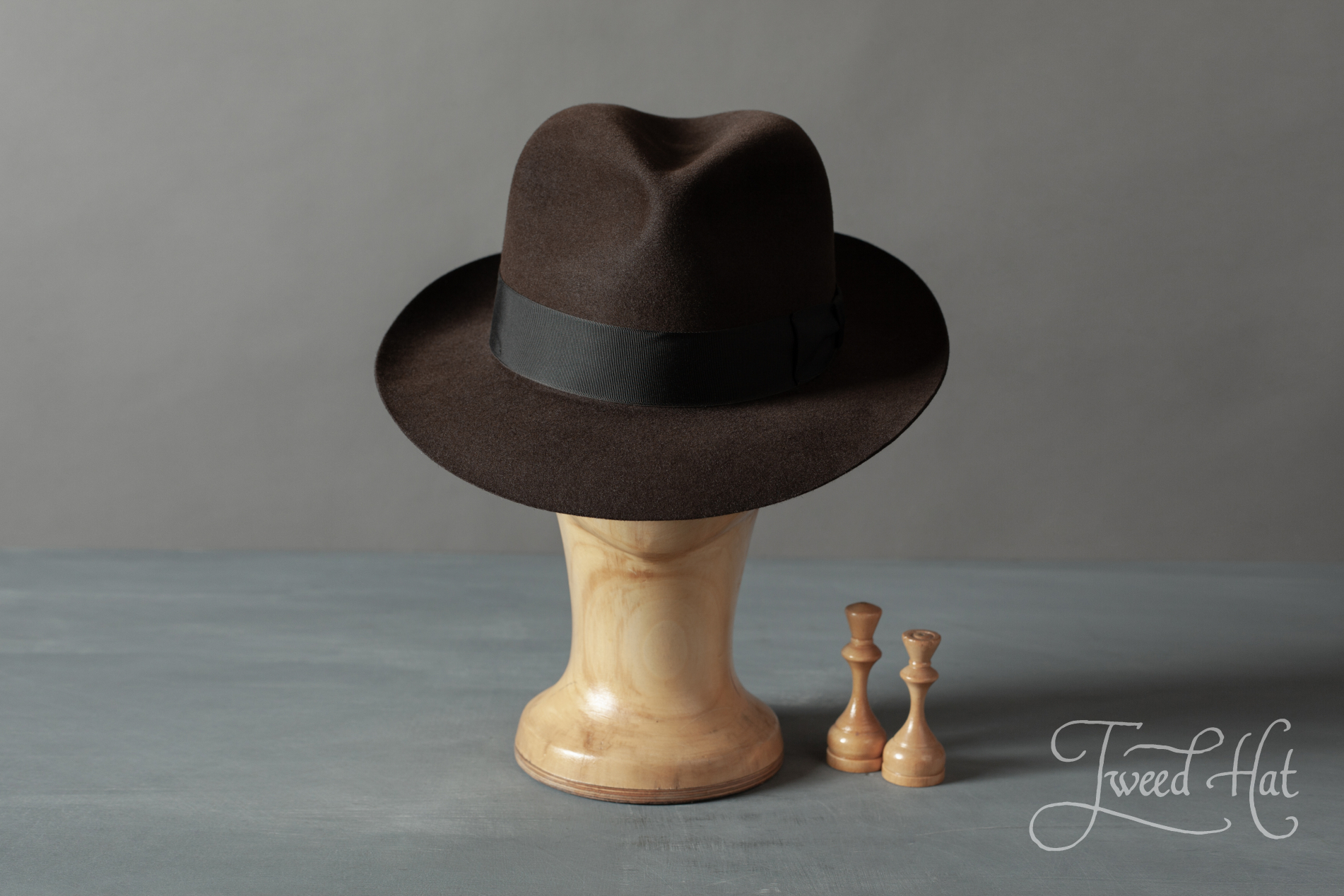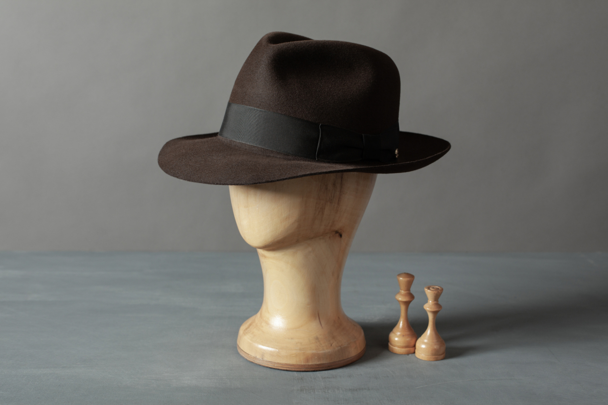 The hat's shape echoes classic fedoras of the first half of the 20th century: a high crown, a strongly curved brim, and a wide band.