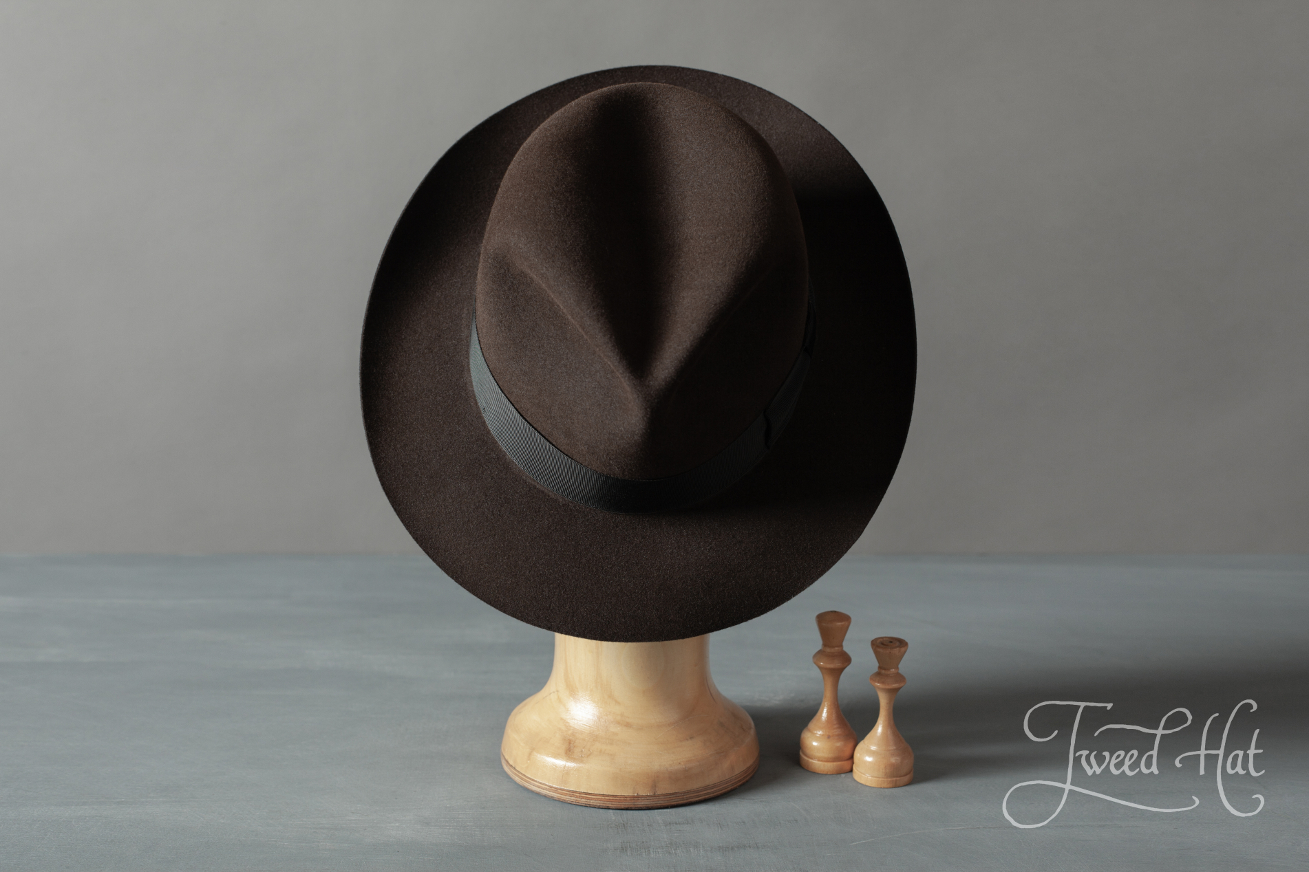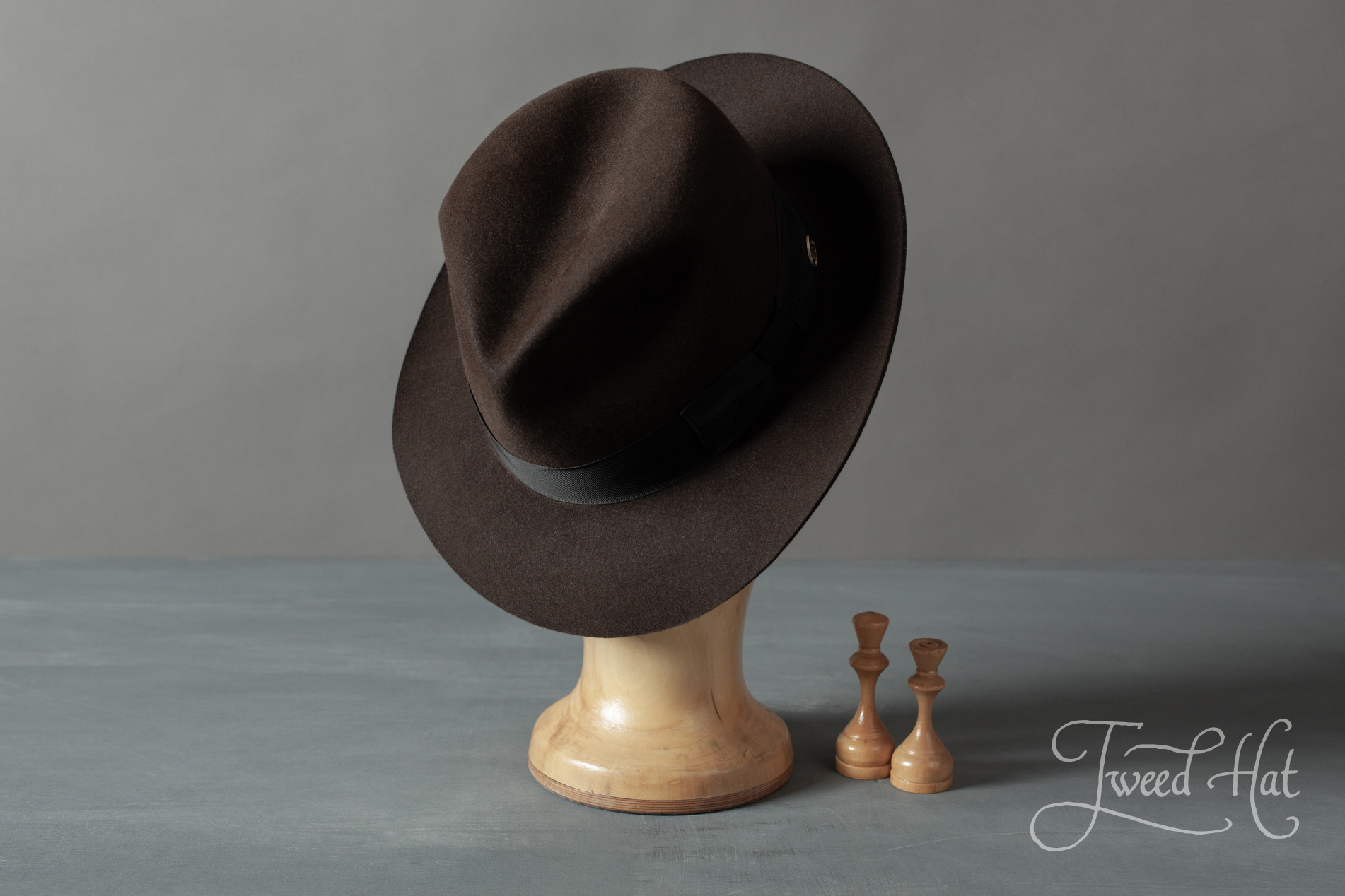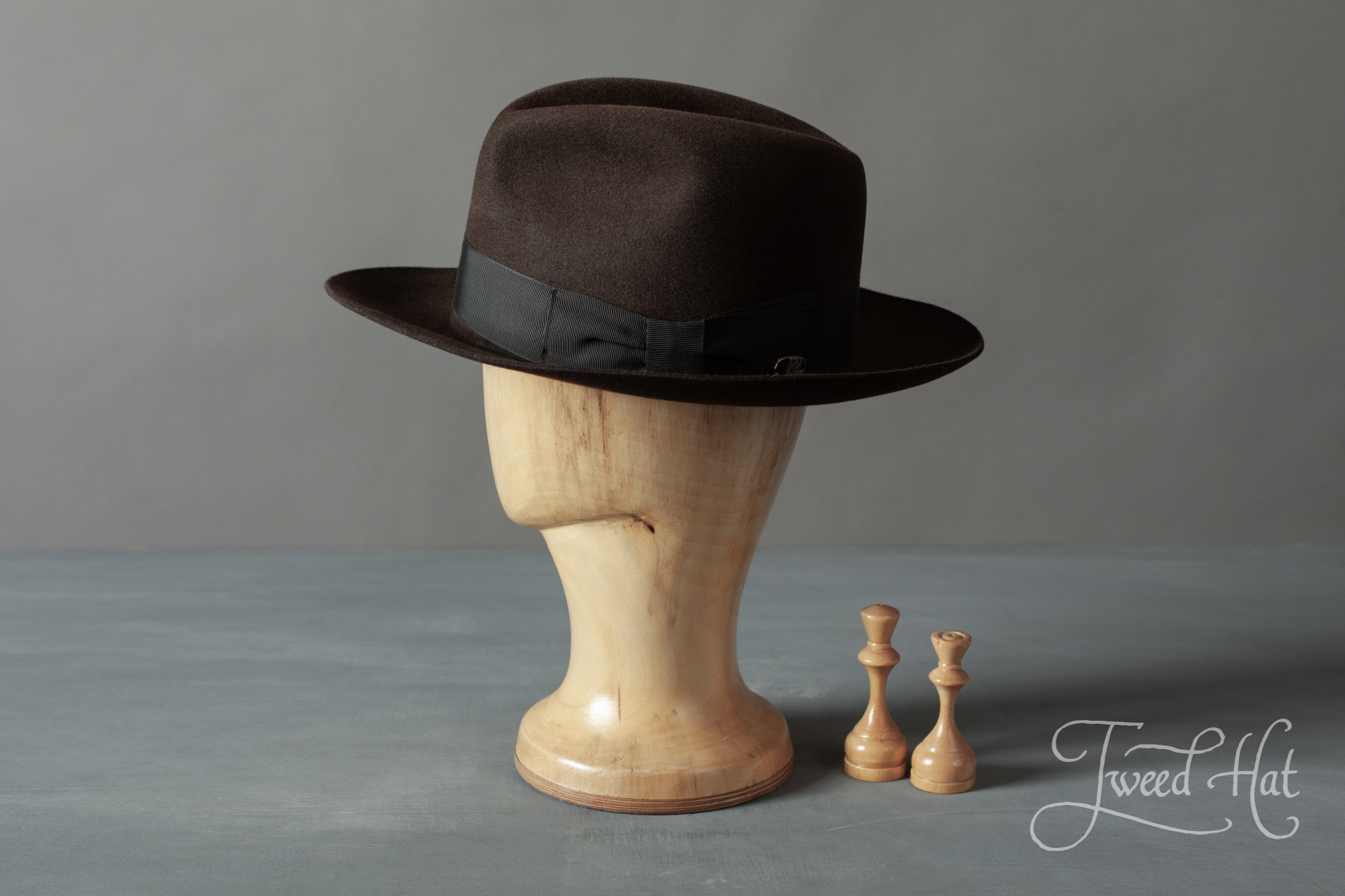The hat's shape echoes classic fedoras of the first half of the 20th century: a high crown, a strongly curved brim, and a wide band.