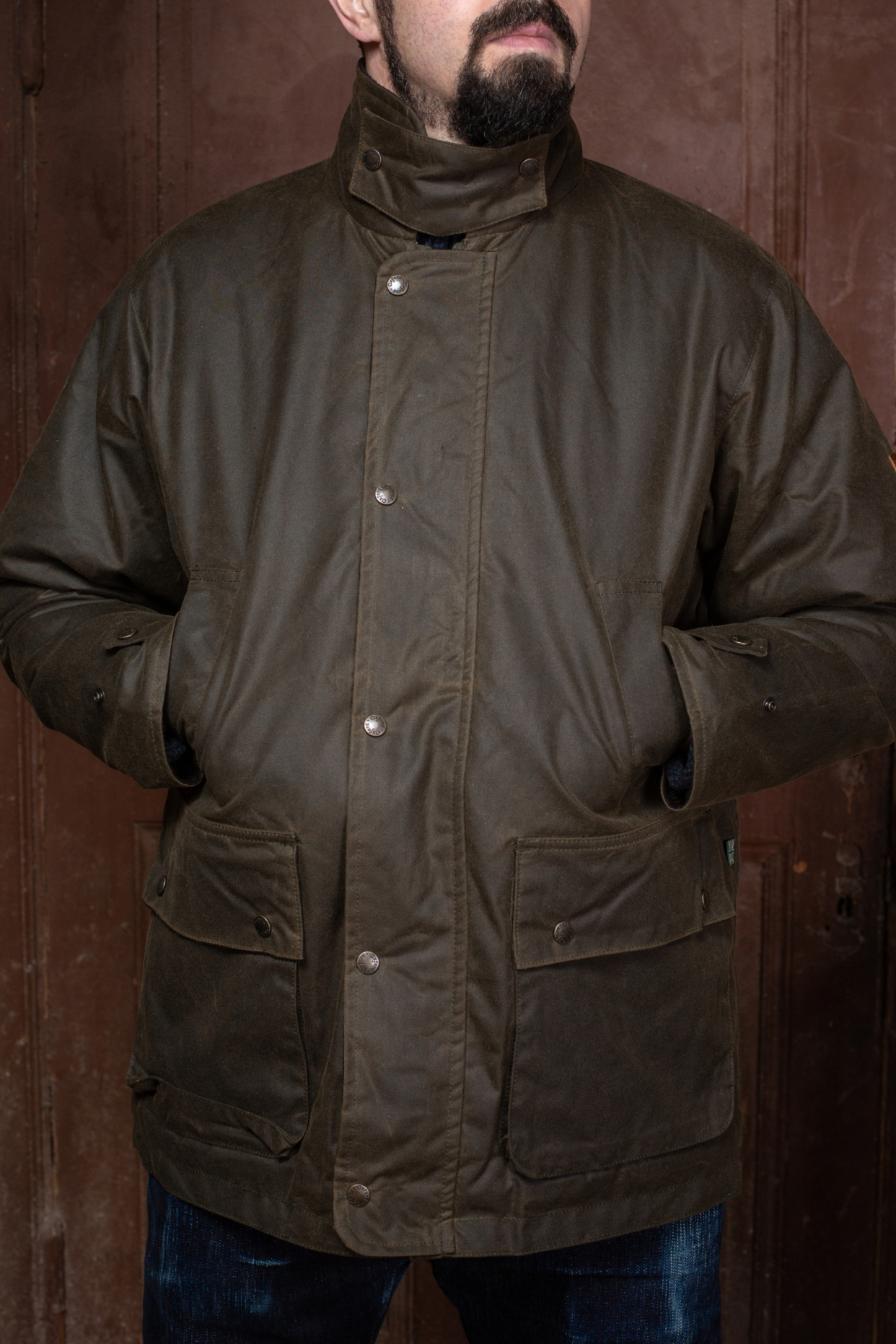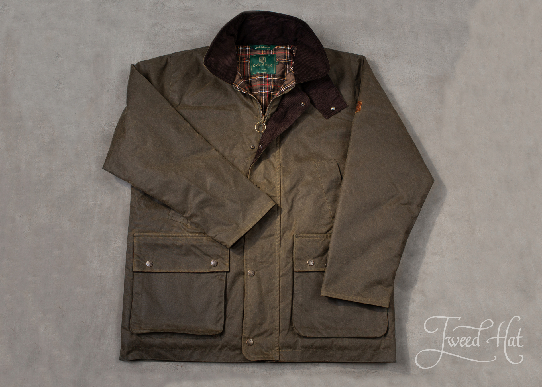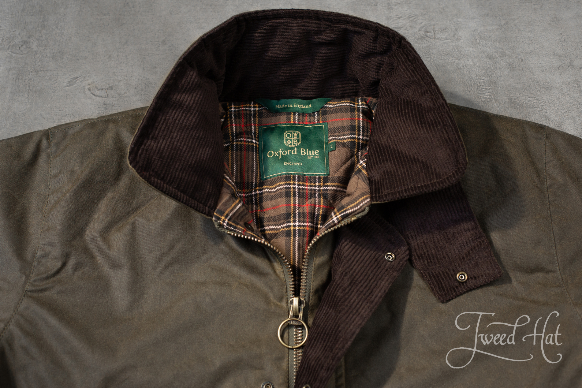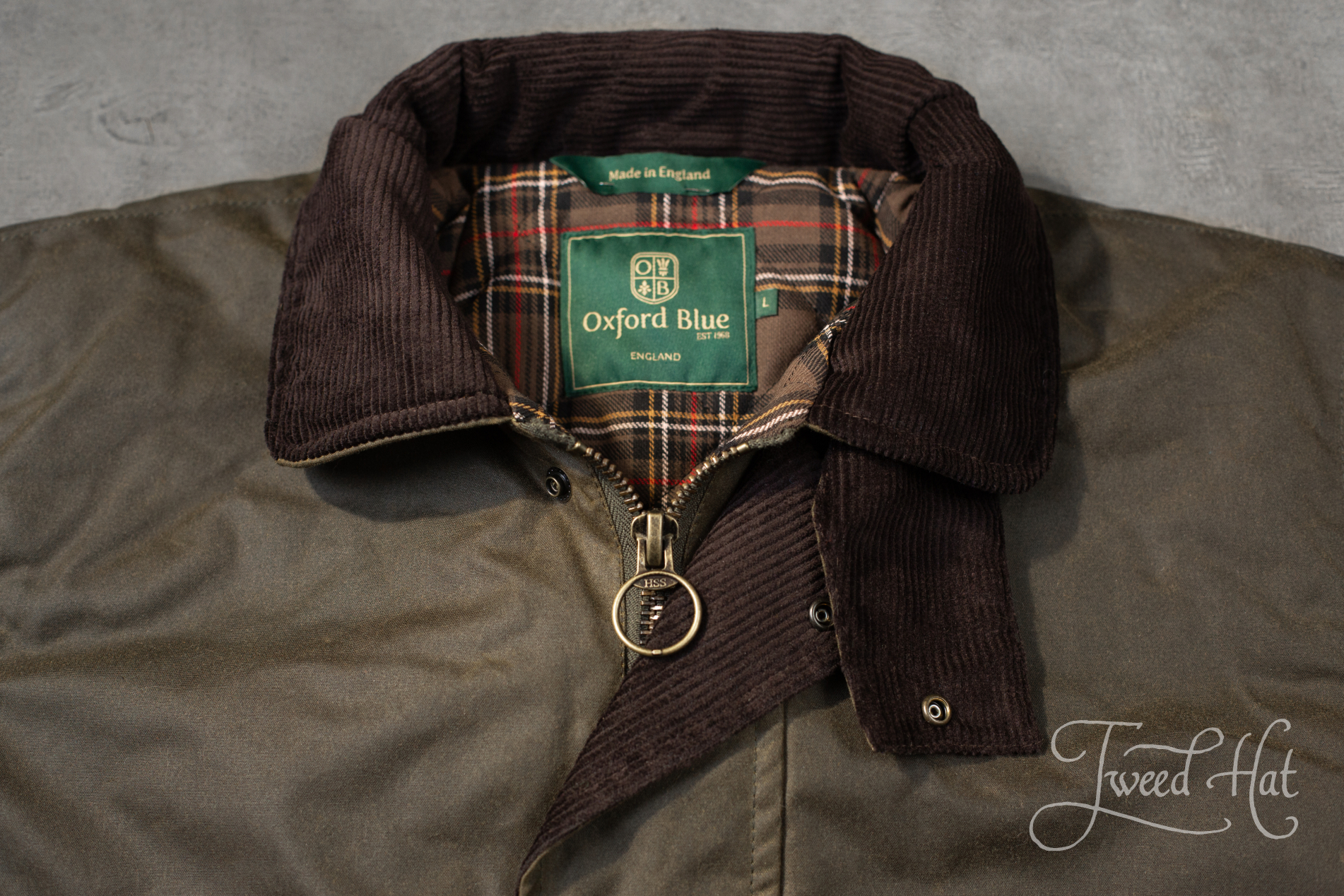 A classic English country jacket made of authentic waxed cotton from the Oxford Blue mill in Birmingham.