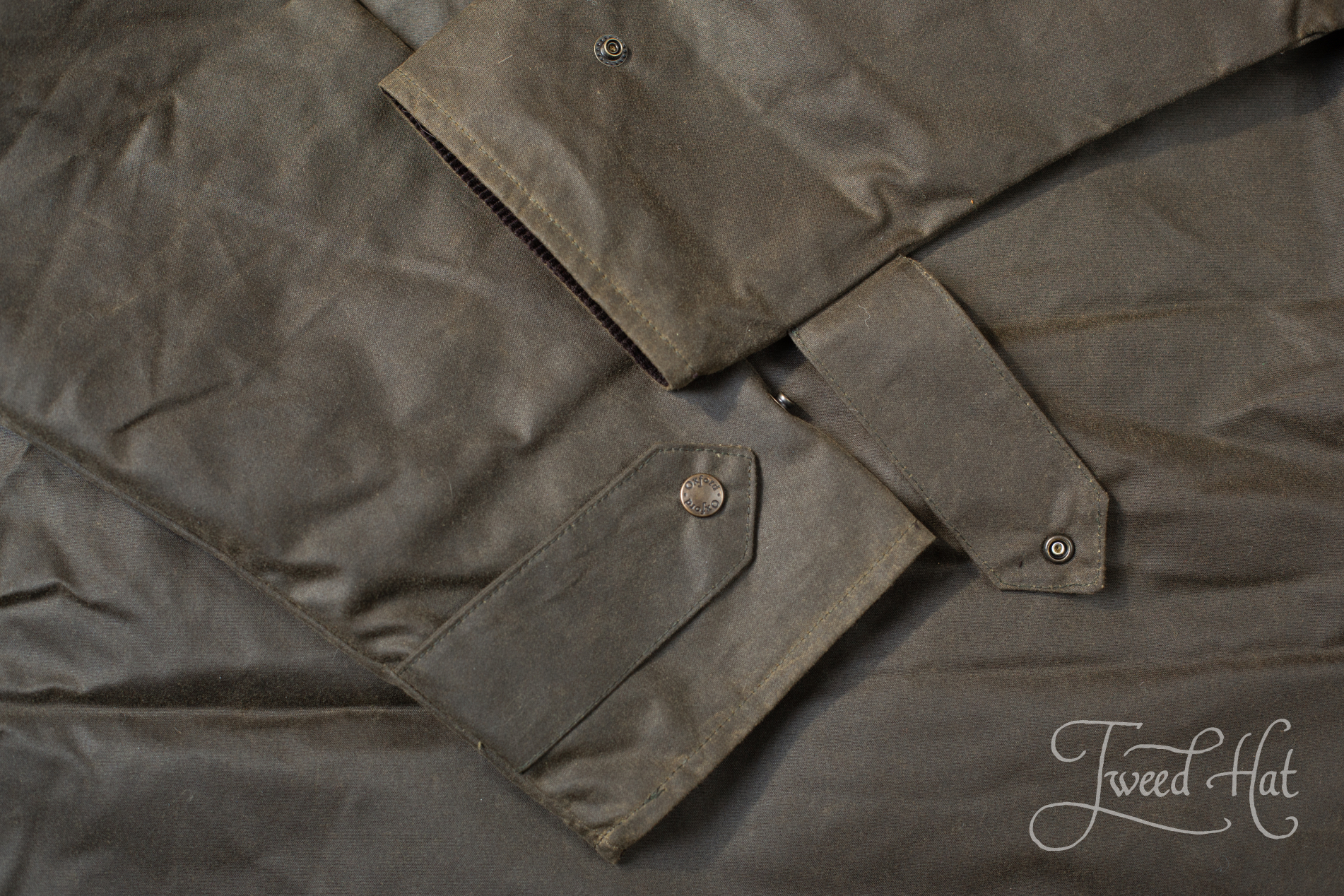 - Adjustable sleeve cuffs with a tab and two brass snaps,