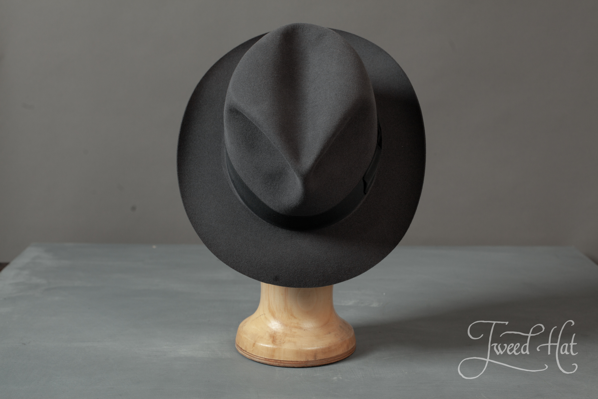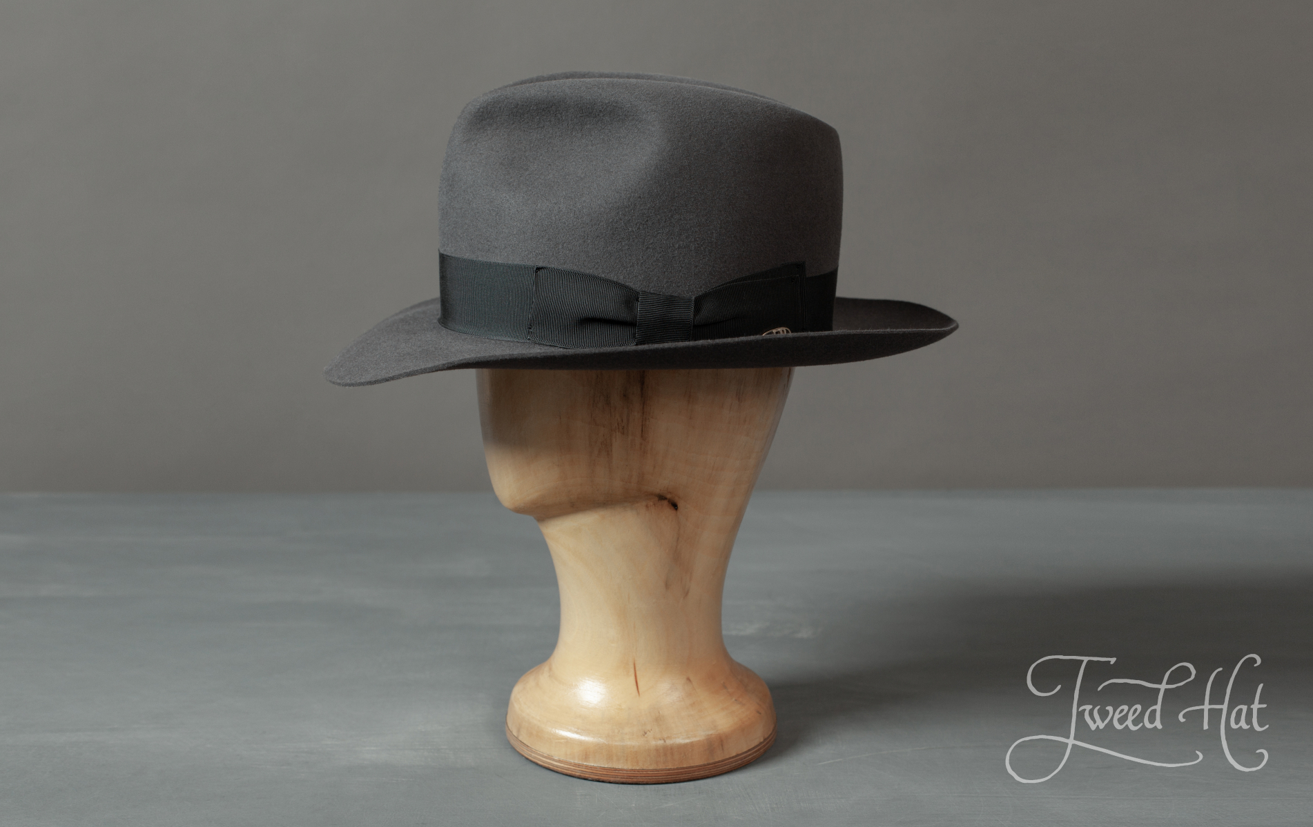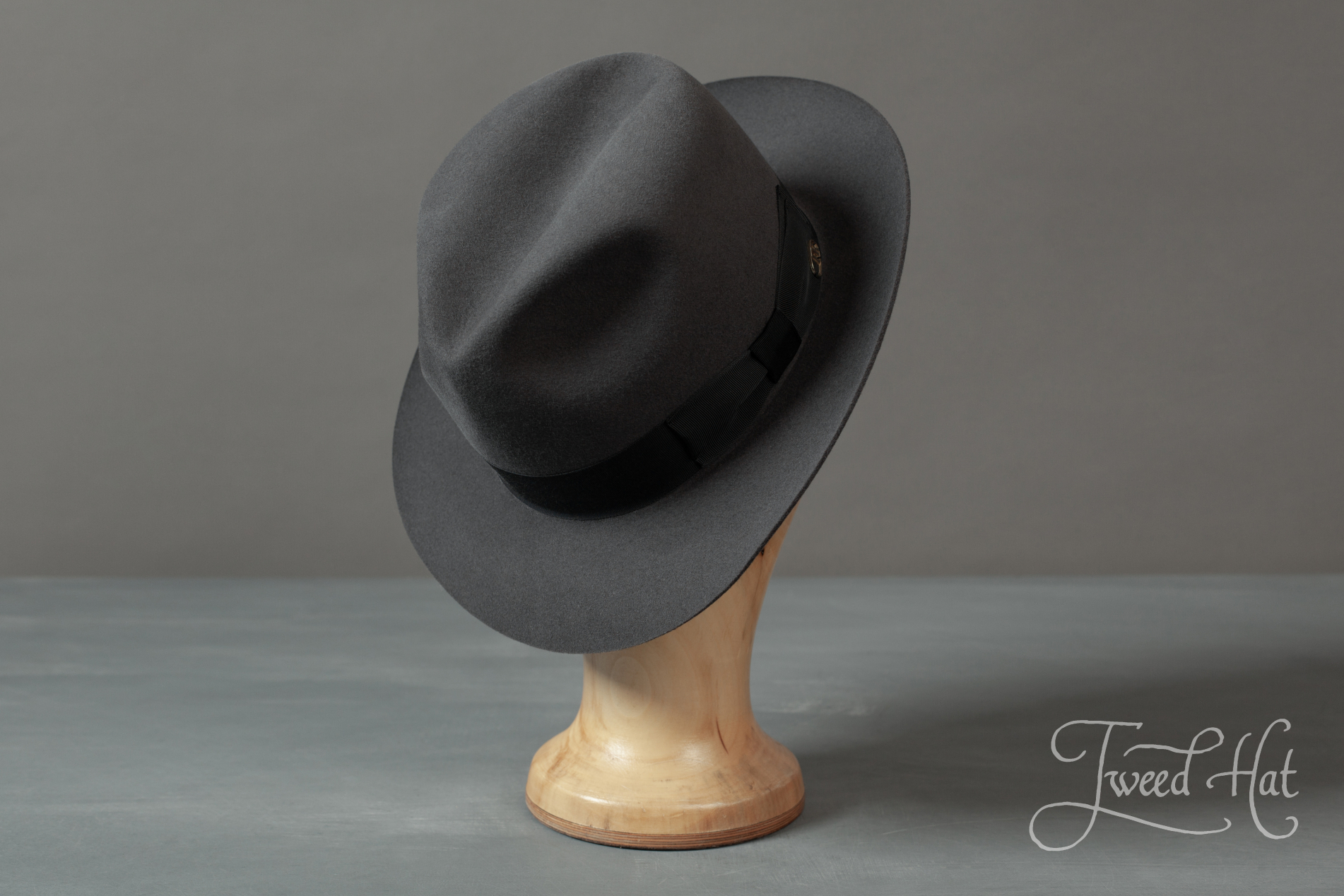 The hat's shape echoes classic fedoras of the first half of the 20th century: a high crown, a strongly curved brim, and a wide band.