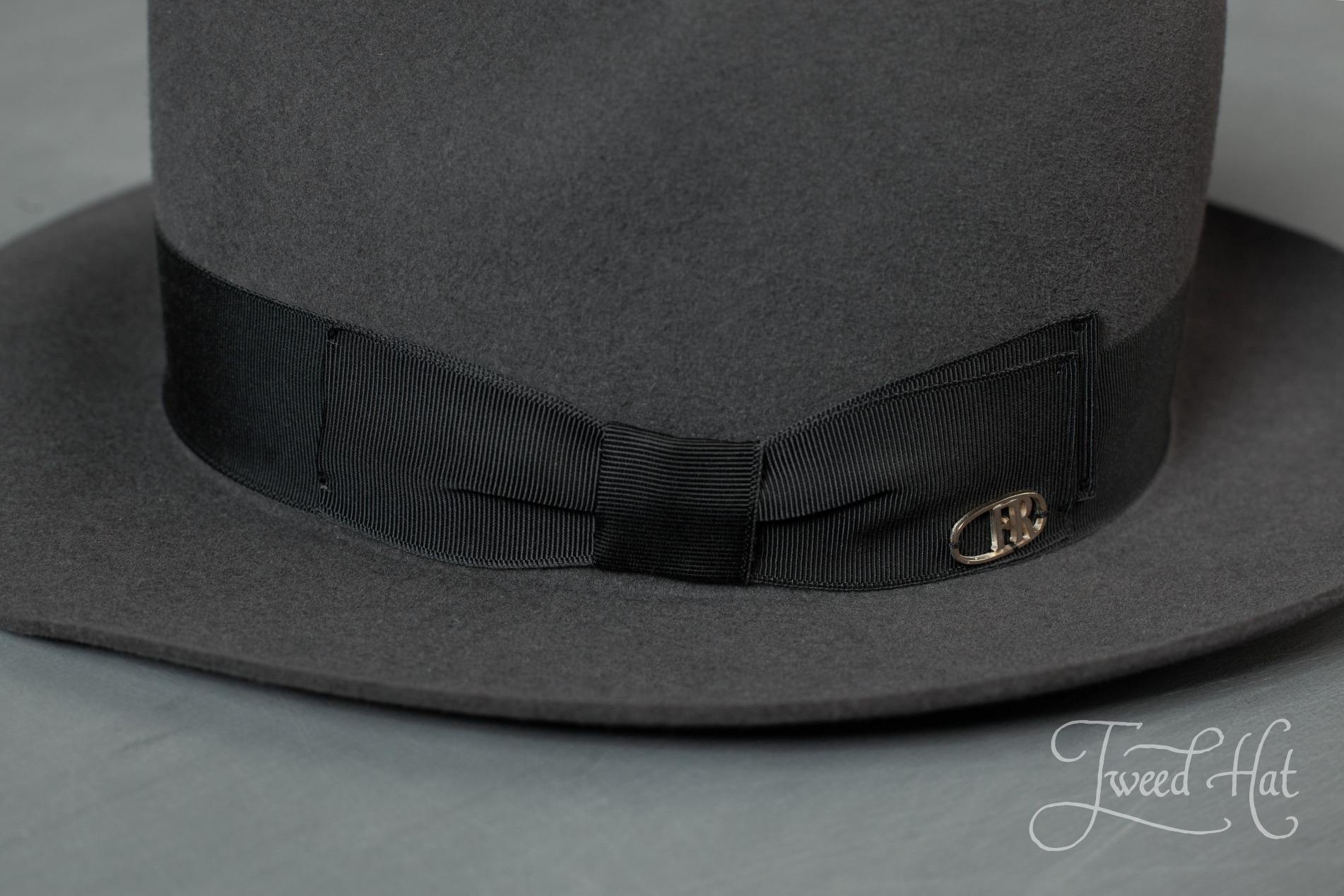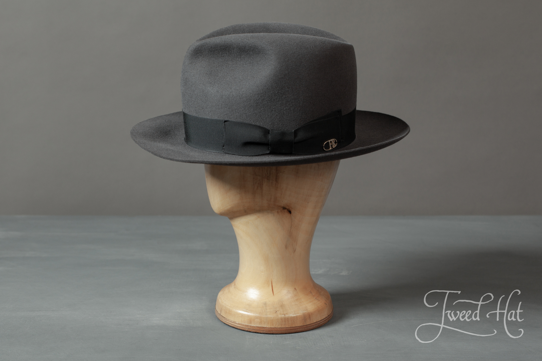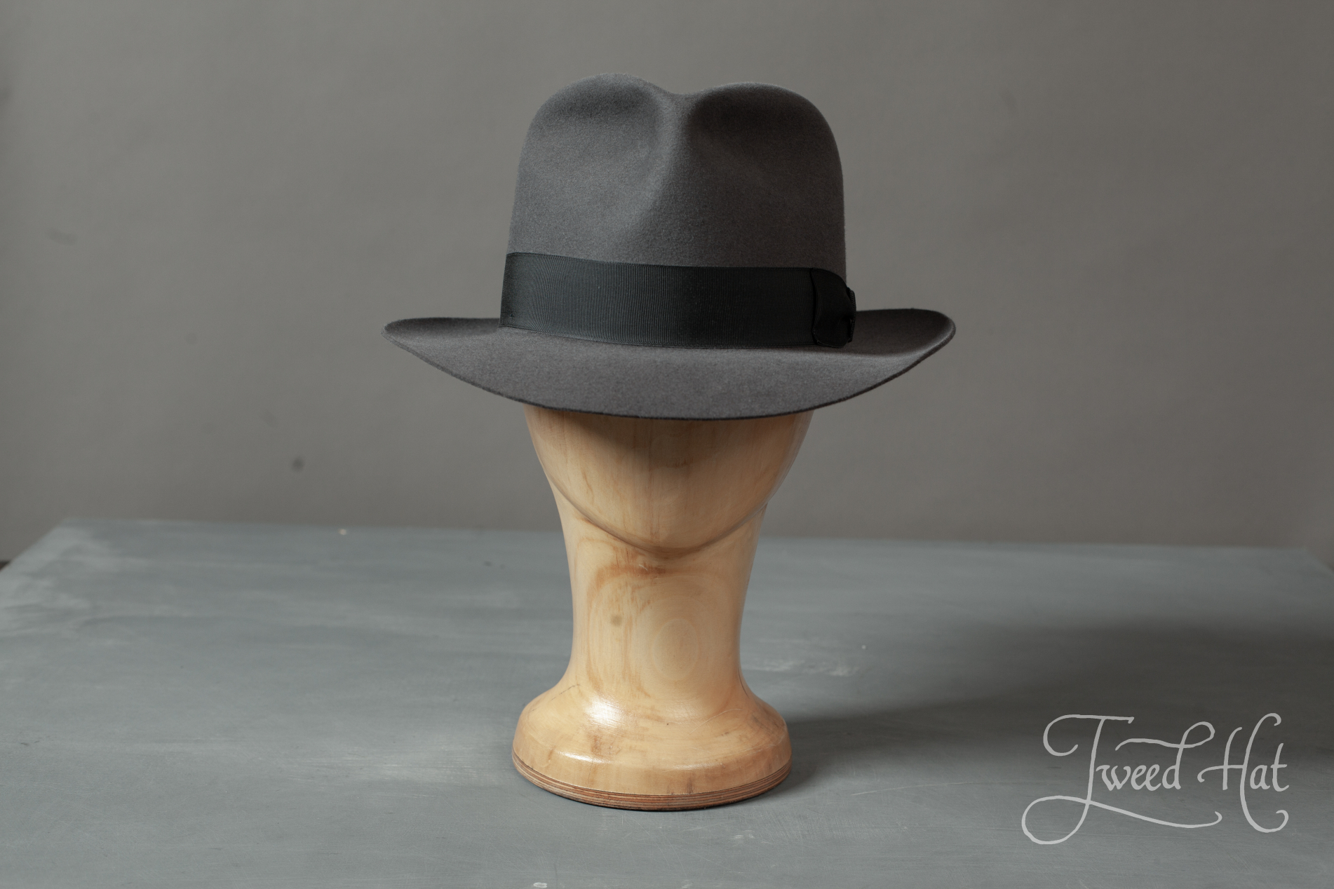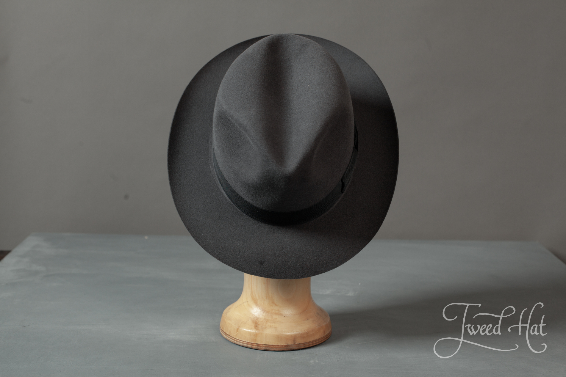 The hat's shape echoes classic fedoras of the first half of the 20th century: a high crown, a strongly curved brim, and a wide band.