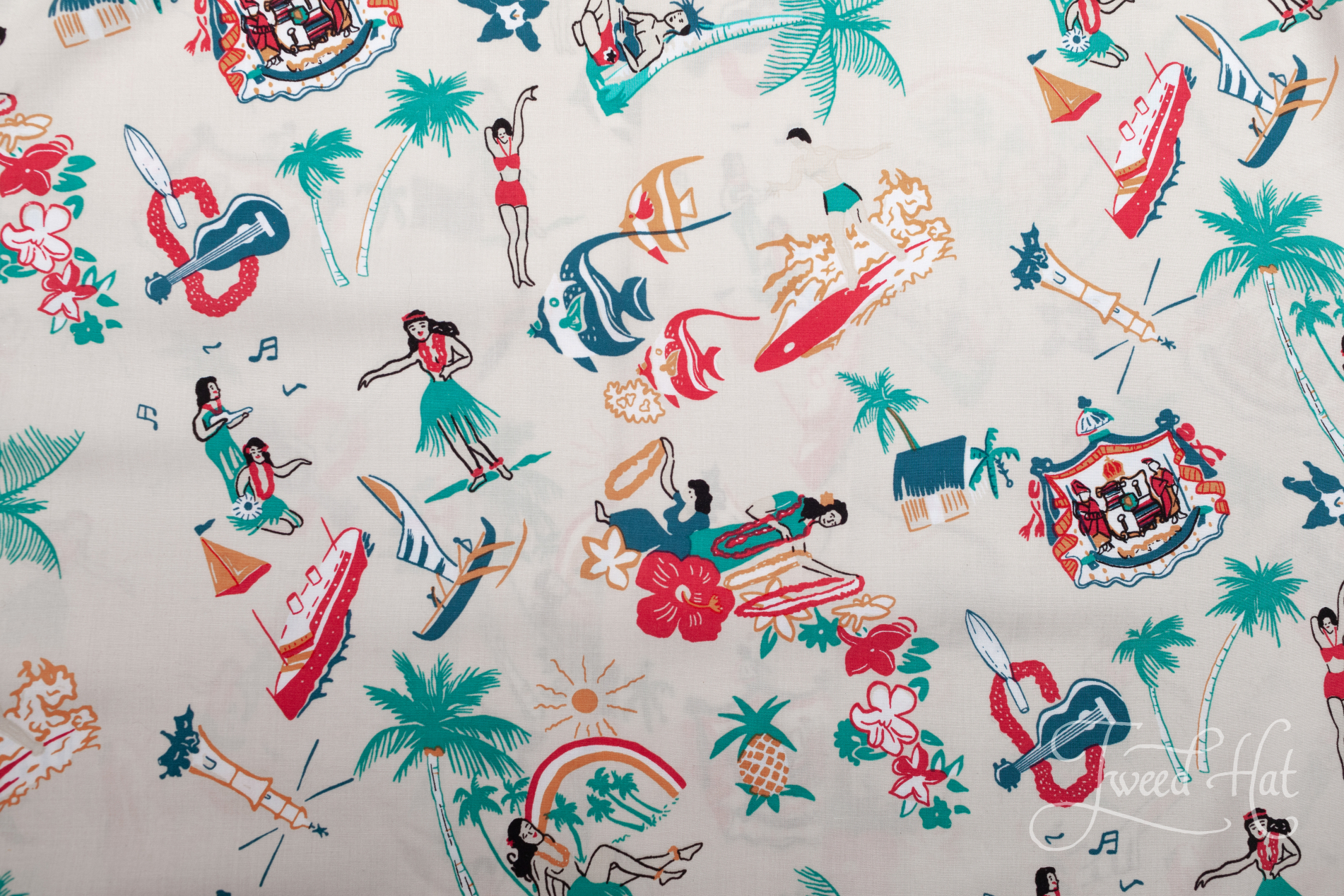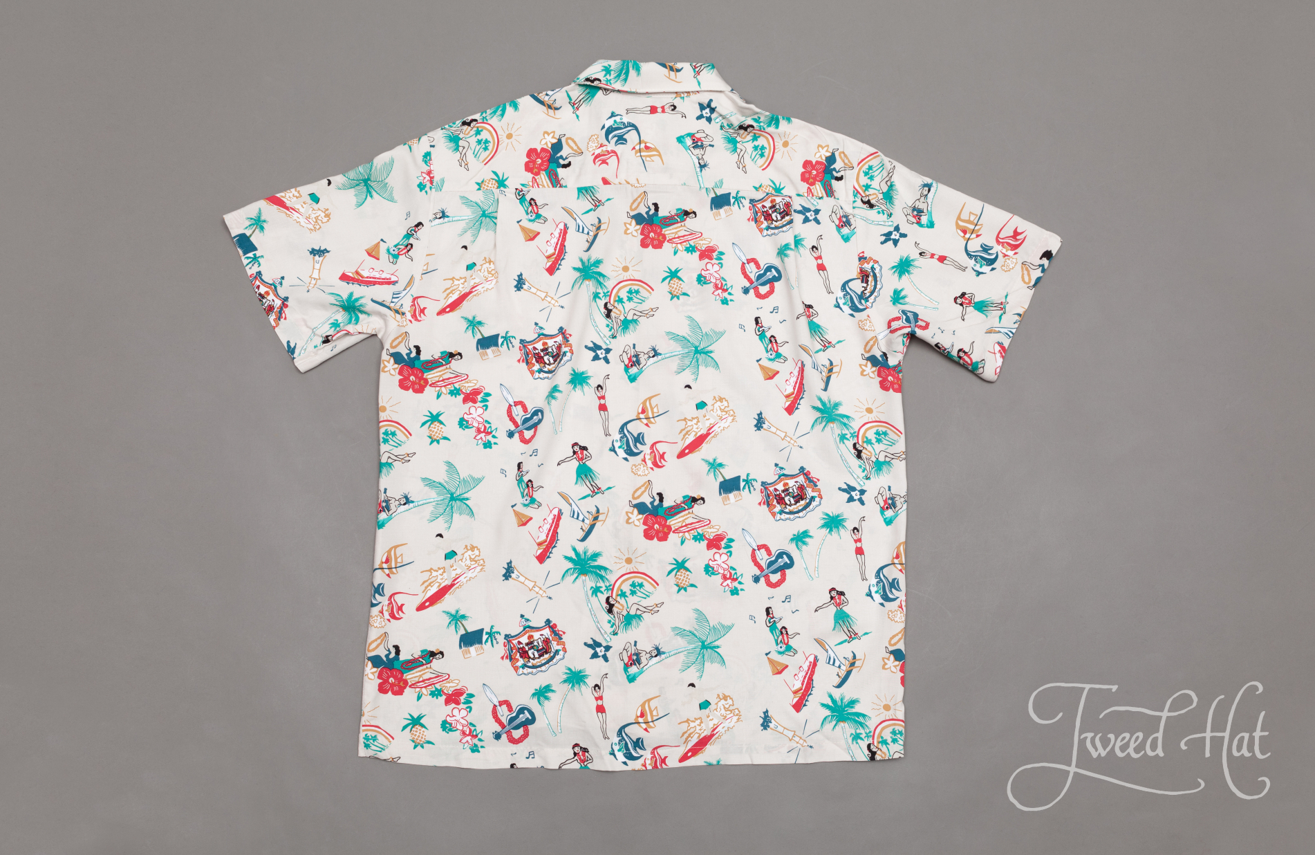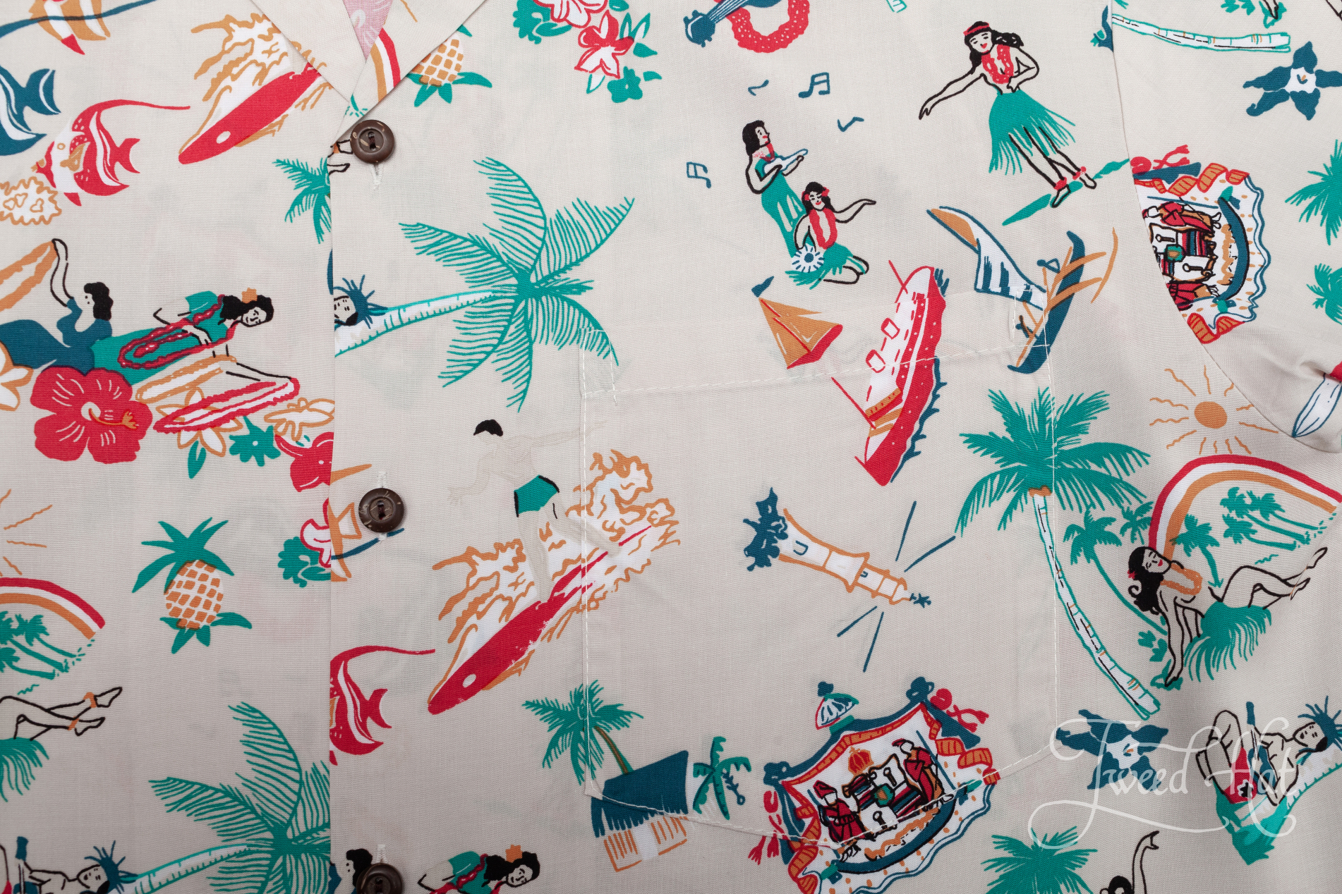 Light Beige Rayon Aloha Shirt with Vintage Hawaii Images by Two Palms Hawaii