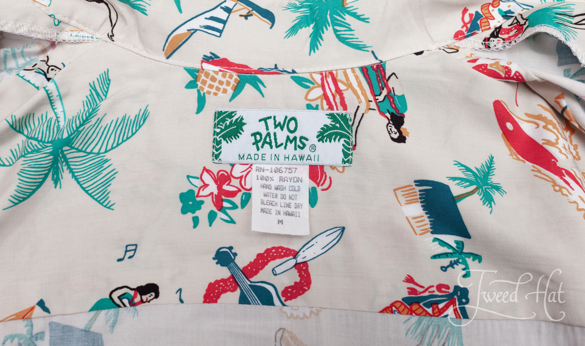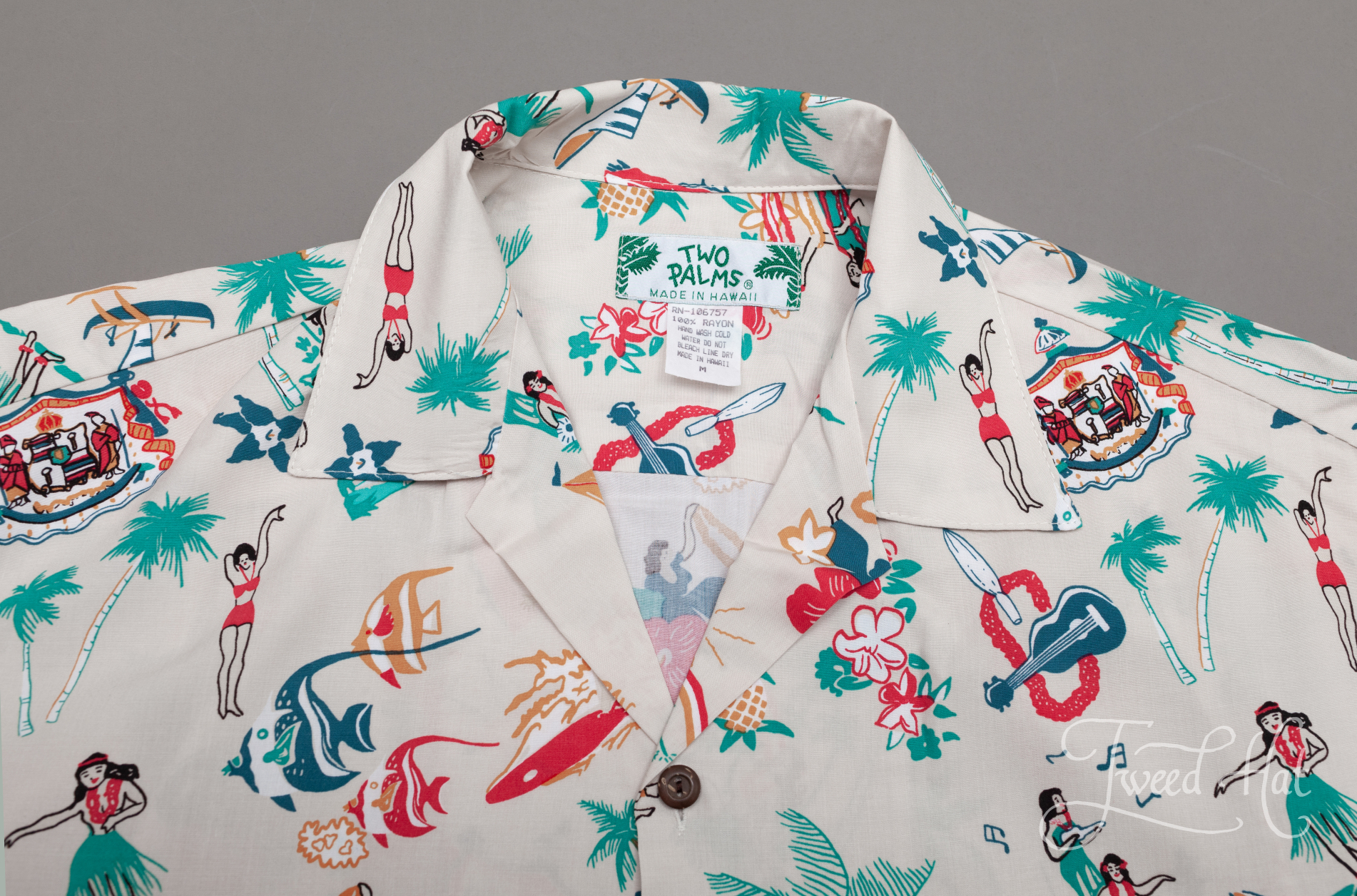Светло-бежевая гавайская рубашка с винтажными образами из рэйона Two Palms Hawaii /100% Rayon/