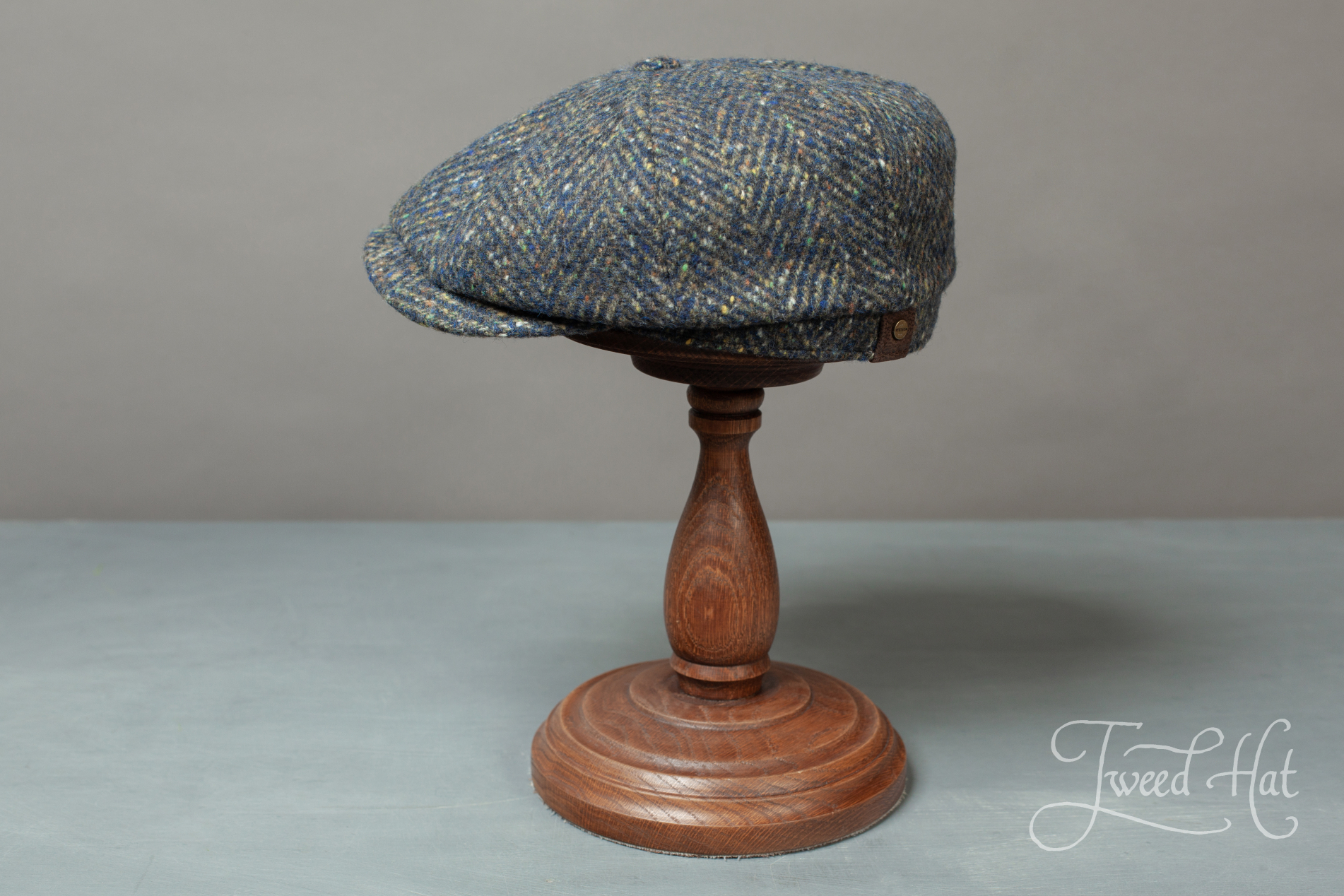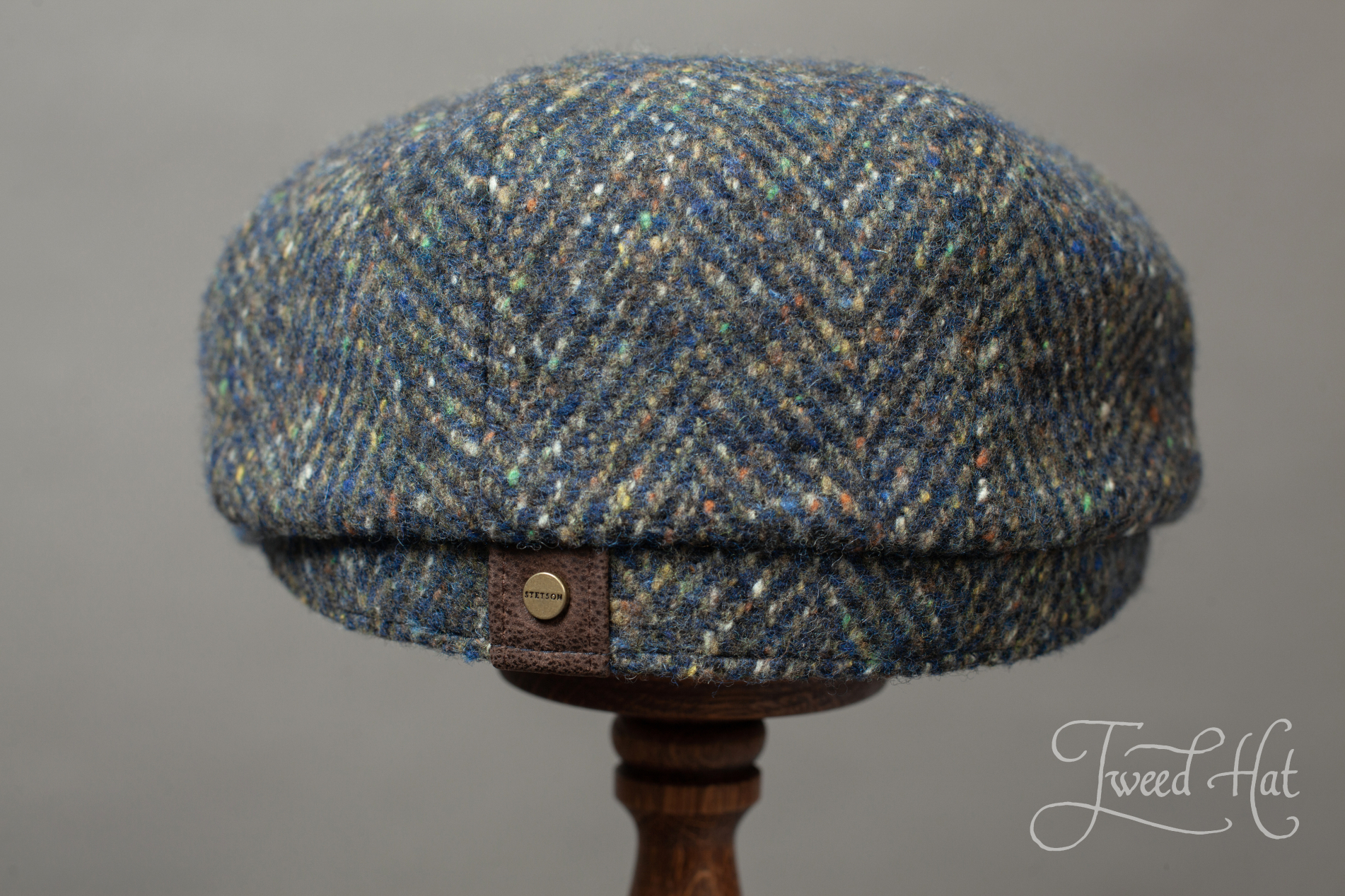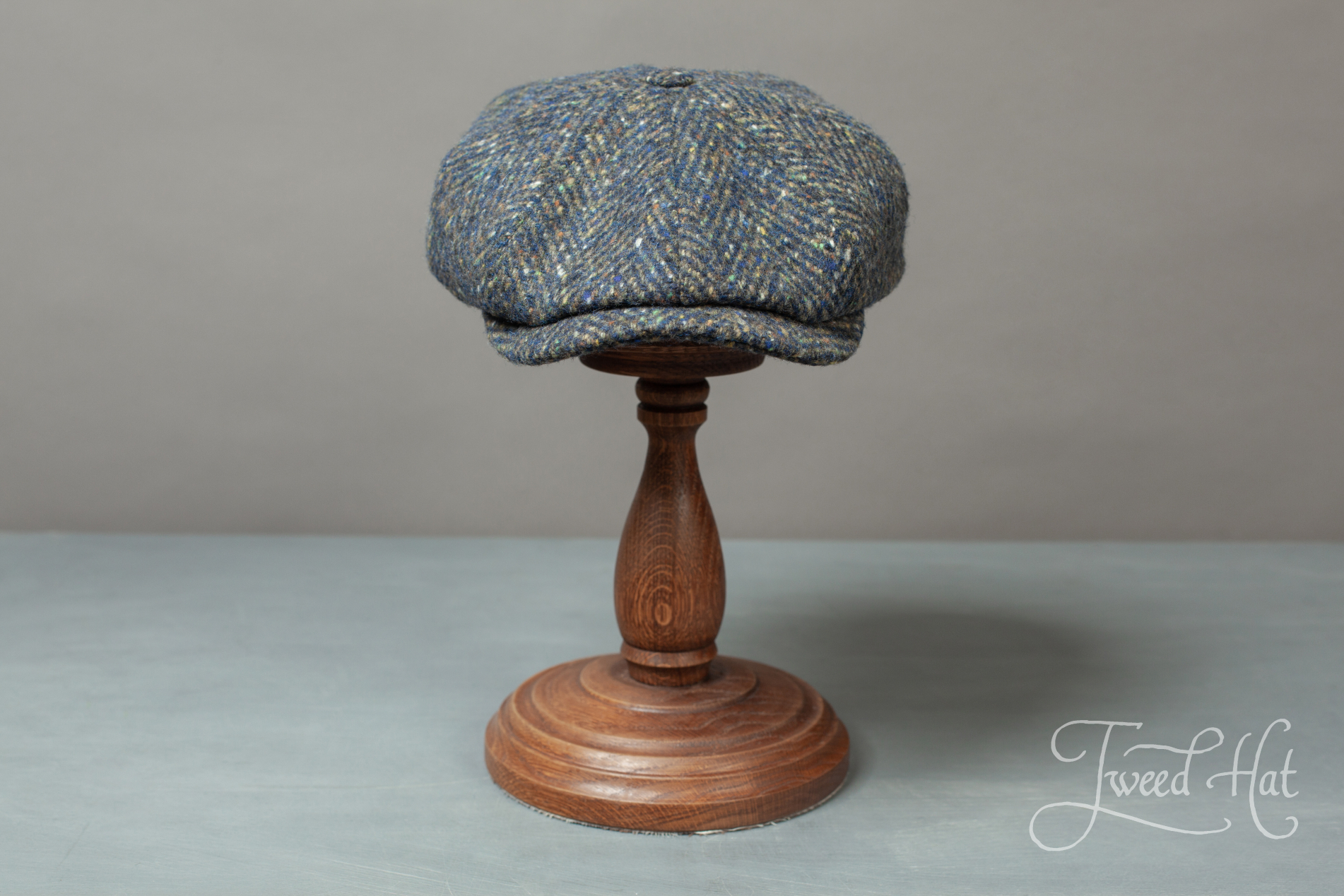 The cap is made of soft and dense herringbone tweed in beige and blue hues, with inclusions of other colors.