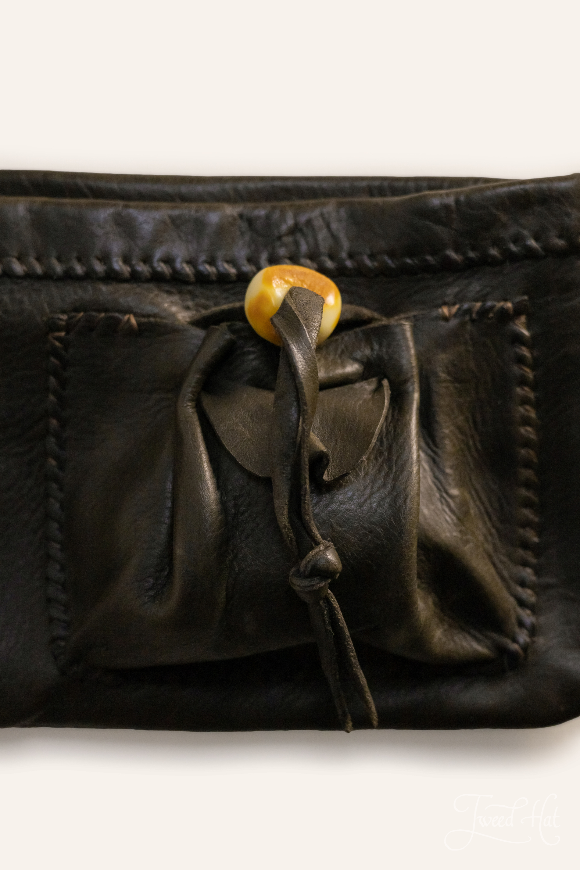 It firmly closes by means of a sturdy leather button, the same as used in olden wallets and shoes, and a half-belt.